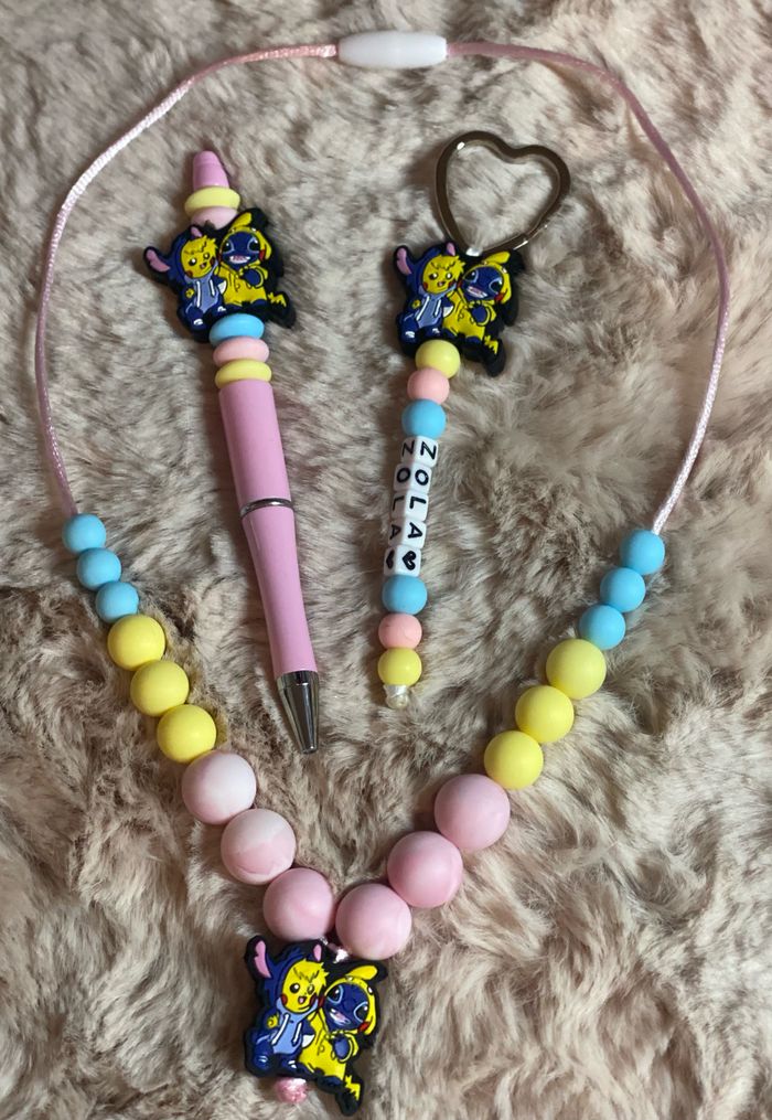 Possible avec énormément de thème Coffret comprenant 1 stylo 1 porte clefs ( pour aller sur la trousse ou le cartable ) Et un collier assortie Venez me demander les theme dispo Pour passer commande il suffit de valider le paiement et de m’envoyez le prénom de l’enfant par message que je puisse réaliser votre commande A partir de 2 articles vous bénéficiez de 5% de réduction 🥰 Réalisation dans la journée et envoie dès le lendemain ( du lundi aux samedi ) Une petite photo du modèle terminé et toujours envoyez que vous puissiez vérifier ☺️