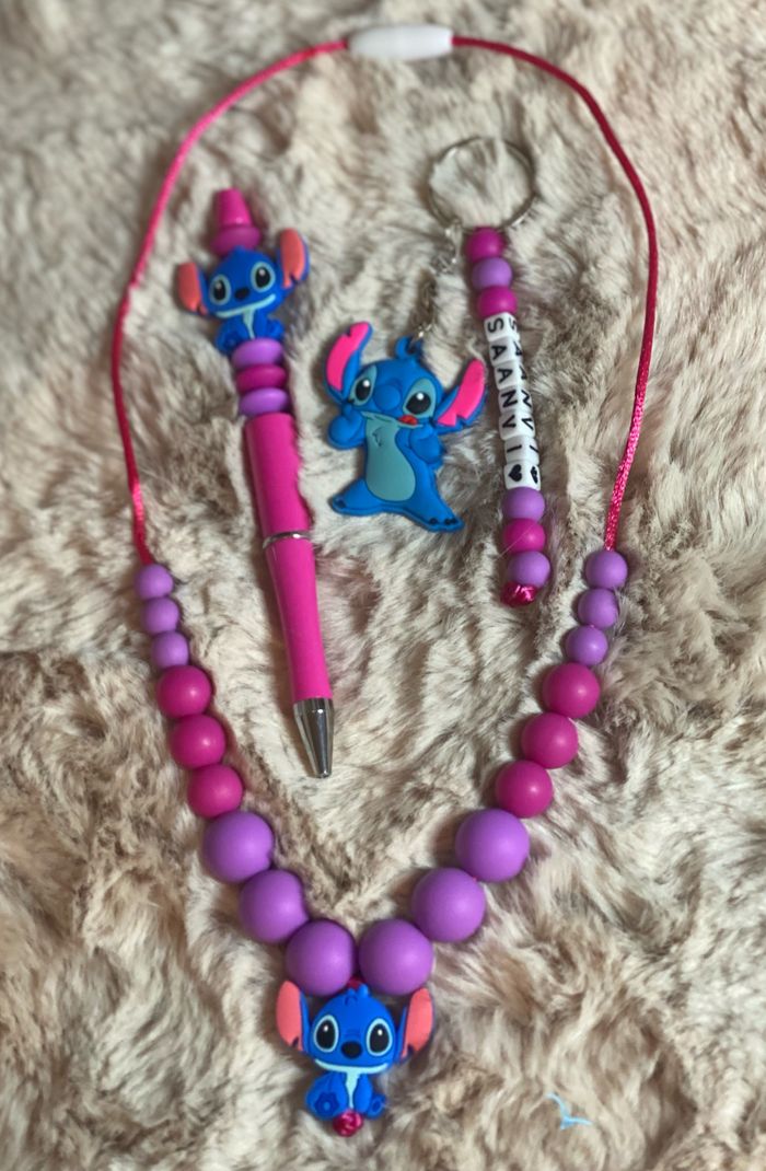 Possible avec énormément de thème Coffret comprenant 1 stylo 1 porte clefs ( pour aller sur la trousse ou le cartable ) Et un collier assortie Venez me demander les theme dispo Pour passer commande il suffit de valider le paiement et de m’envoyez le prénom de l’enfant par message que je puisse réaliser votre commande A partir de 2 articles vous bénéficiez de 5% de réduction 🥰 Réalisation dans la journée et envoie dès le lendemain ( du lundi aux samedi ) Une petite photo du modèle terminé et toujours envoyez que vous puissiez vérifier ☺️