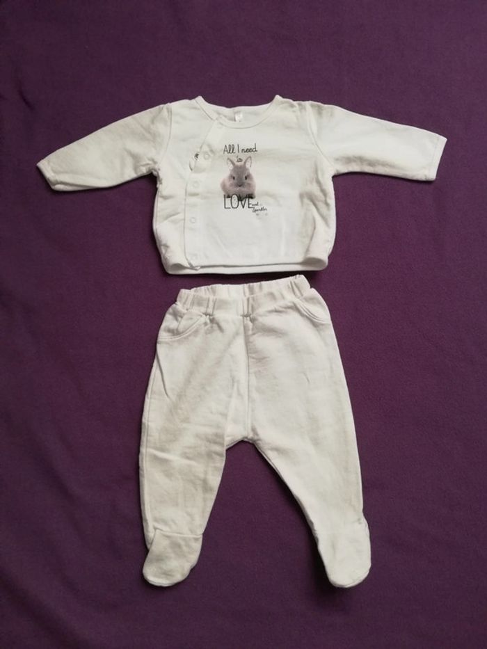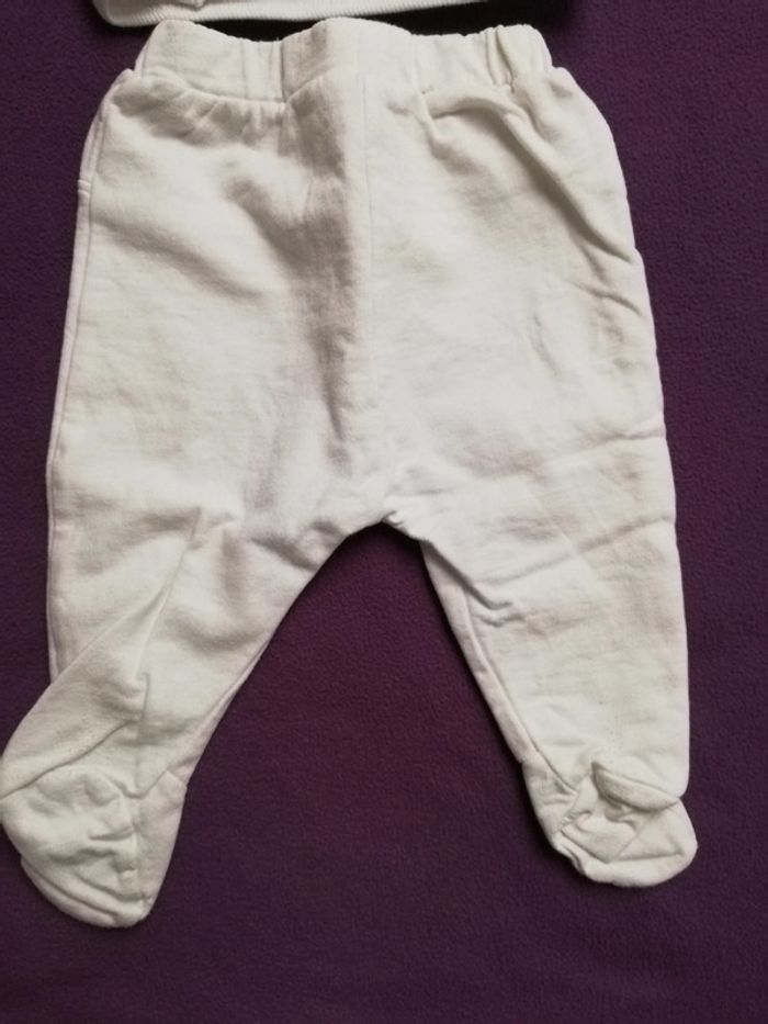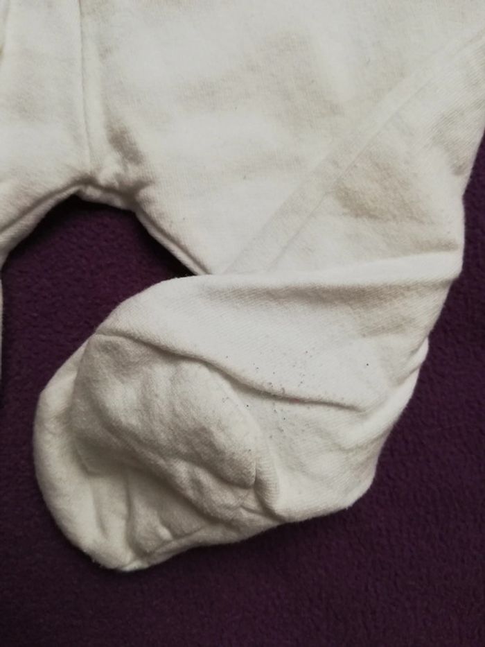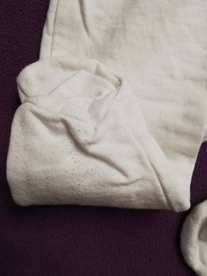 Ensemble tee-shirt manches longues avec pression et pantalon en coton Voir photos les pieds du pantalon sont un peu boulochés sinon la couleur blanche est nickel, pas de tâches