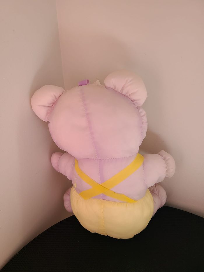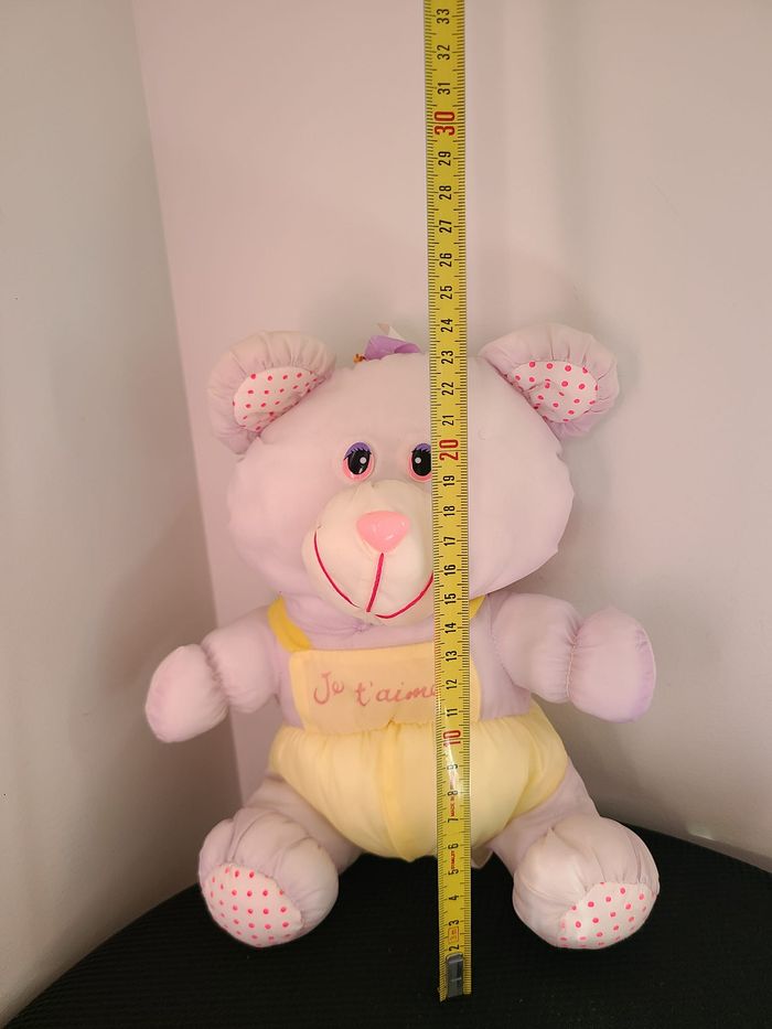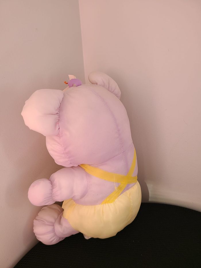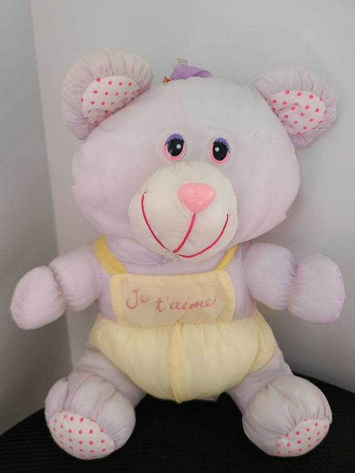 Peluche Puffalump ours mauve salopette jaune pois je t'aime 42 cm 82