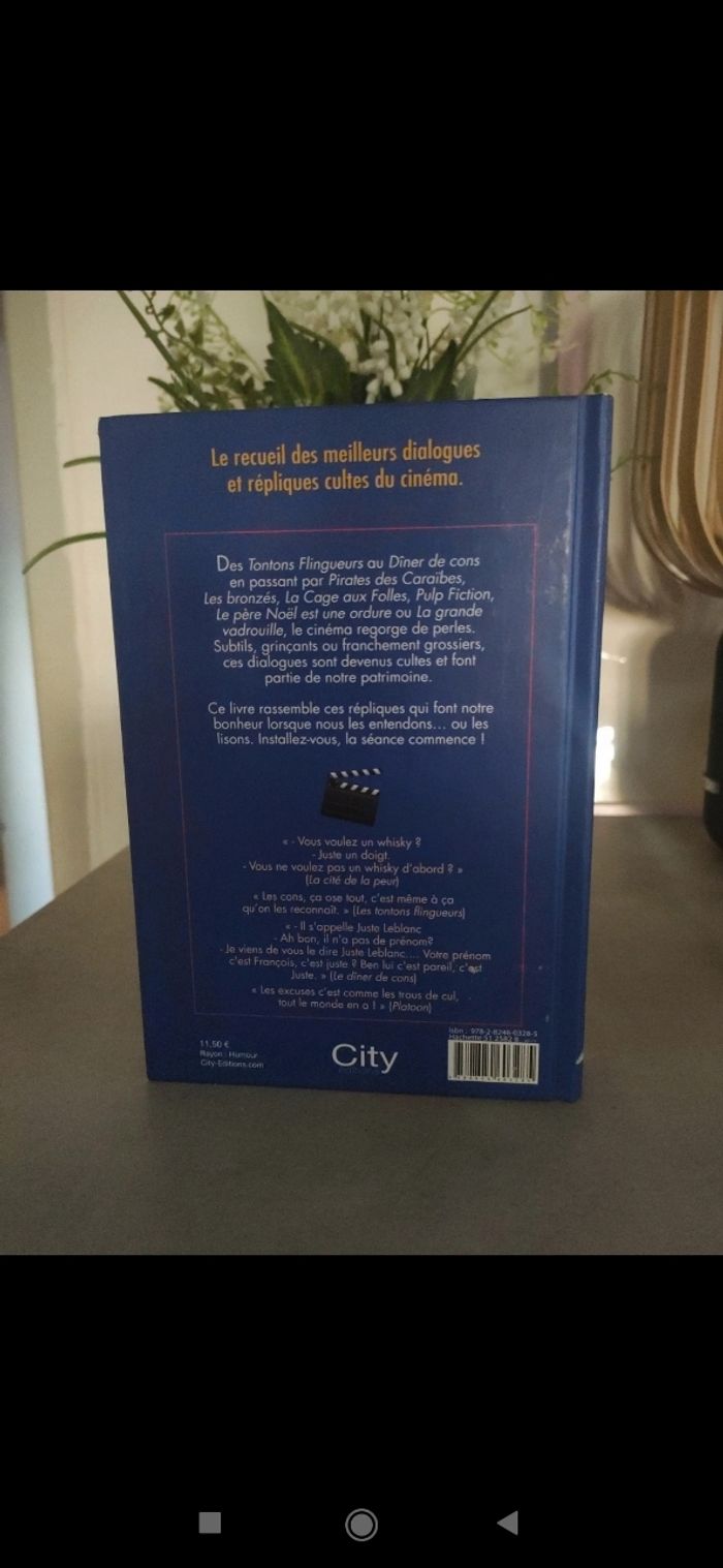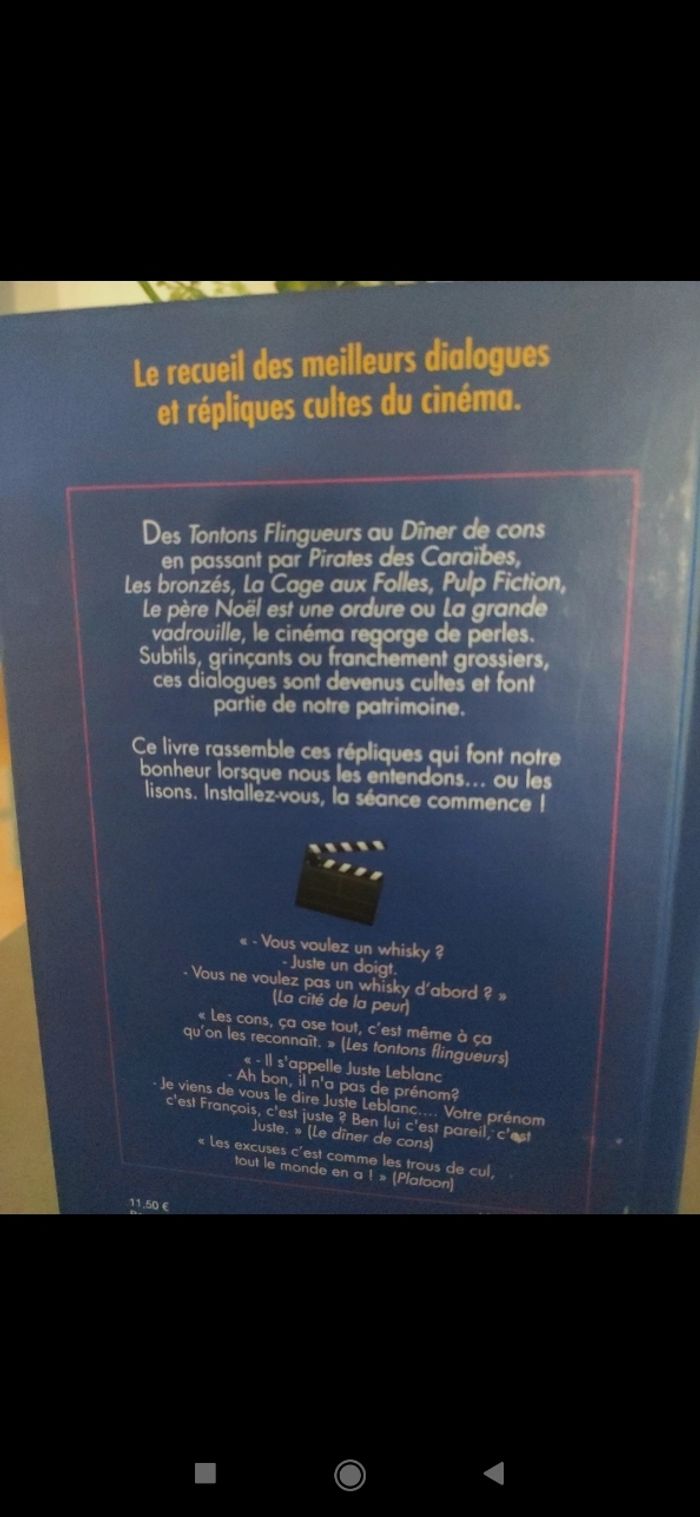Le recueil des meilleurs dialogues et répliques du cinéma. Des Tontons flingueurs au Dîner de cons en passant par Pirates des Caraïbes, Les bronzés, La cage aux folles, Pulp fiction, le Père Noël est une ordure ou La grande vadrouille. Livre en très bon état