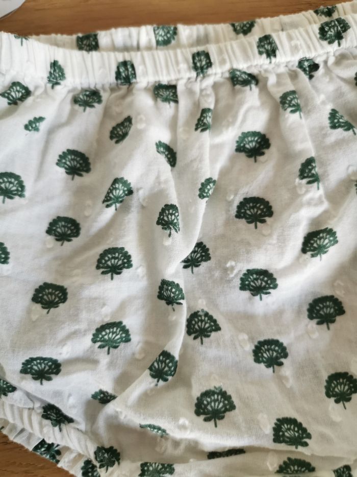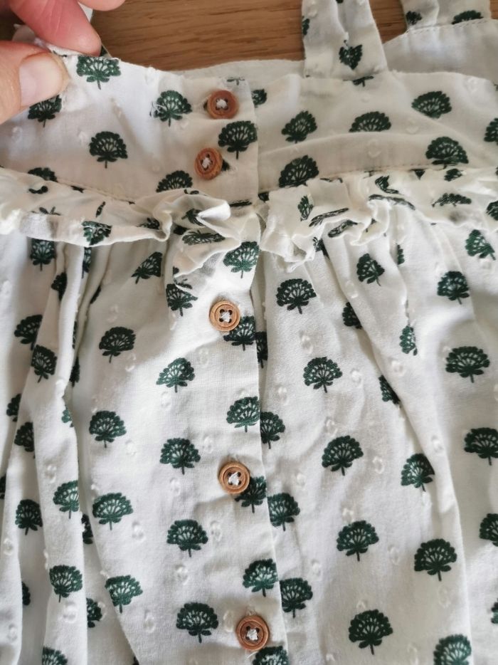 Robe d'été bébé fille 18 mois en excellent état proche du neuf de la marque boutchou. Elle est très chic avec ses boutons en bois et sa culotte bloomer assortie. Elle est en coton biologique.