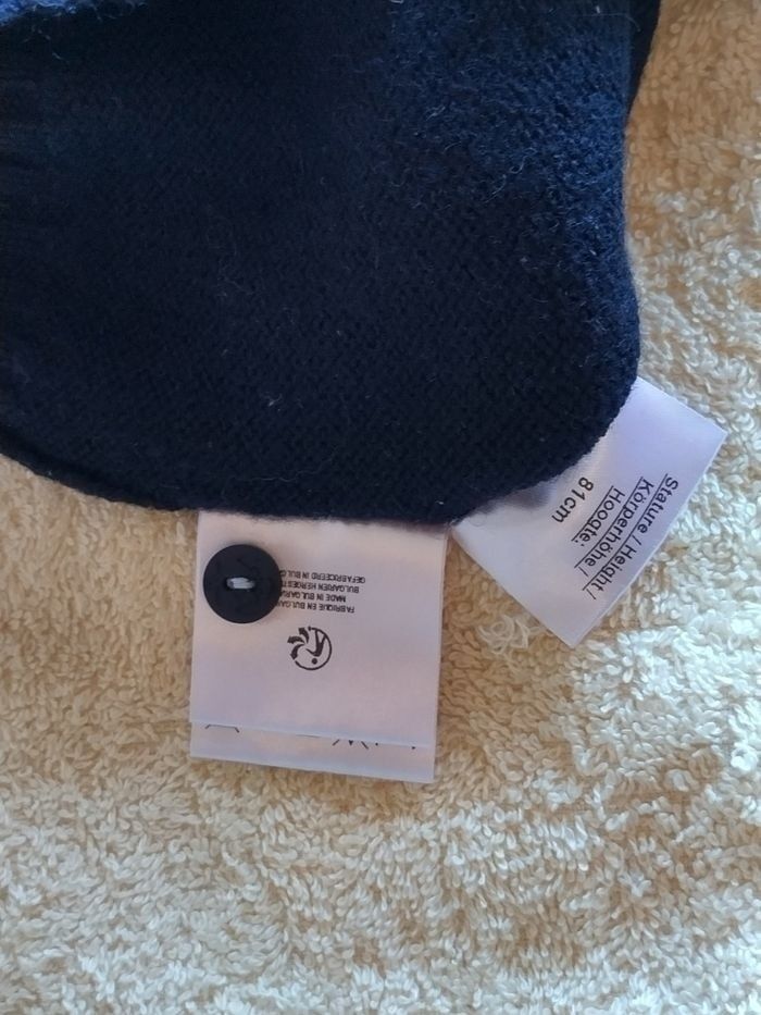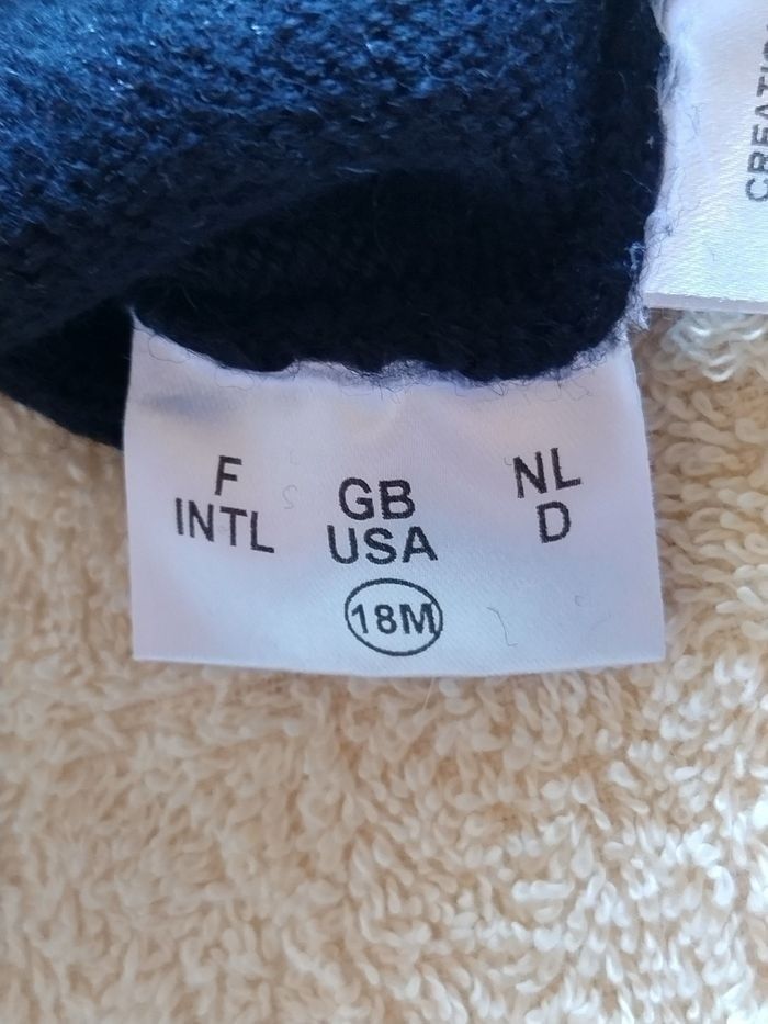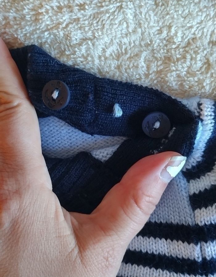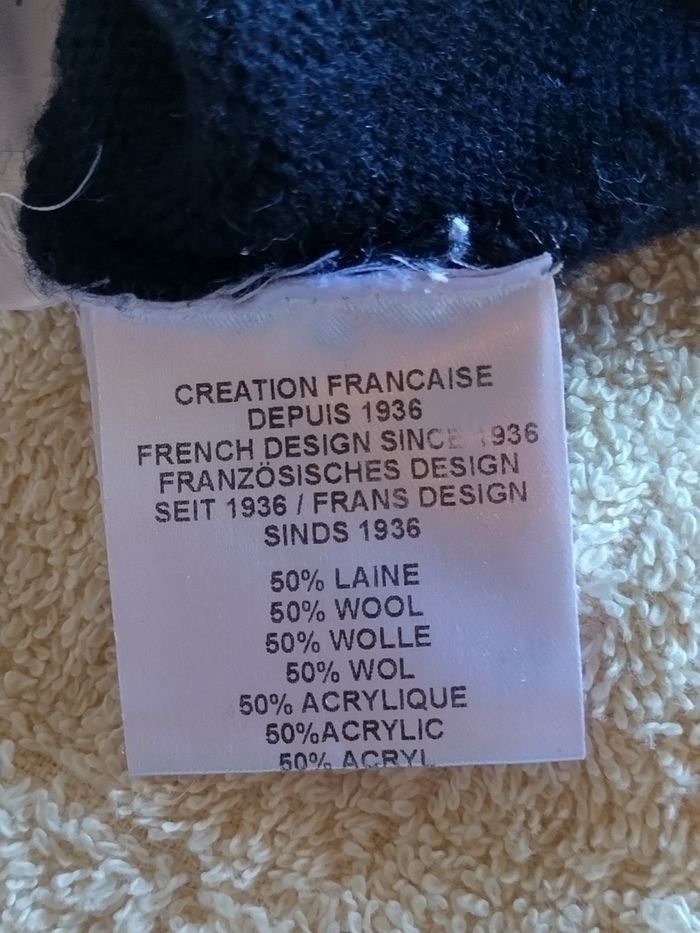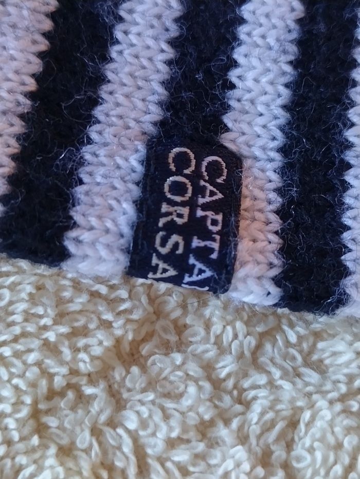 Beau pull marin noir et bleu en laine de la marque marine française Captain Corsaire (création française depuis 1936, appartient à la marque Saint James) pour un bébé de 12 à 18 mois. Il manque un bouton au niveau du col (voir photo) mais, pour le remplacer, il y a un bouton de secours attaché à l'étiquette intérieure. Il a été porté et présente des signes d'usure et d'imperfections mais reste tout de même en bon état. Et pas de tâche ni de trou. C'est un pull à la base de très bonne qualité avec le savoir faire de Saint James. Sympa pour des journées froides hivernales en ville ou des vacances à la mer ou à la campagne. Matières : 50% laine, 50% acrylique Aisselle à aisselle : environ 26 cm Épaule au bas du pull : environ 31 cm