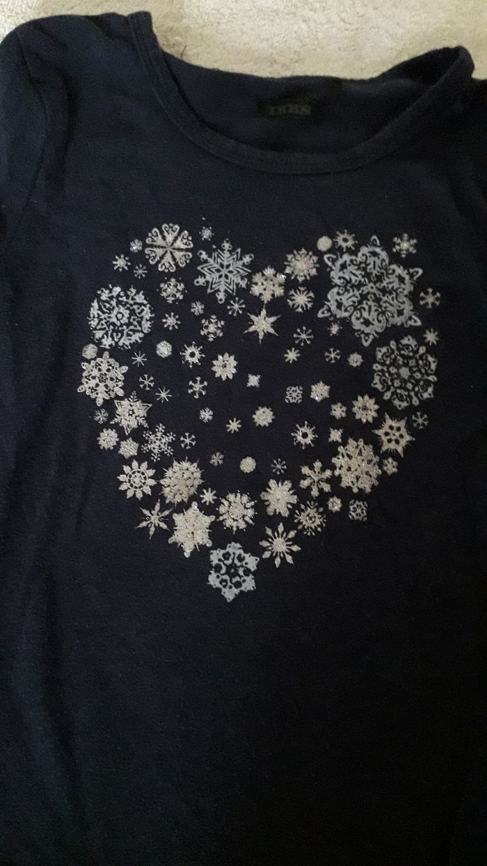 Tee shirt fille manches longues couleur marine motif coeur légèrement brillant blanc