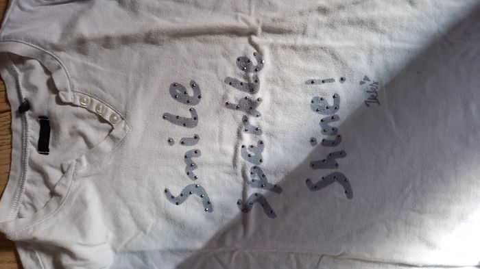 Tee shirt IKKS manches longues blanc inscription grise avec petits brillants . Col en V petits boutons A été porté mais état correct.
