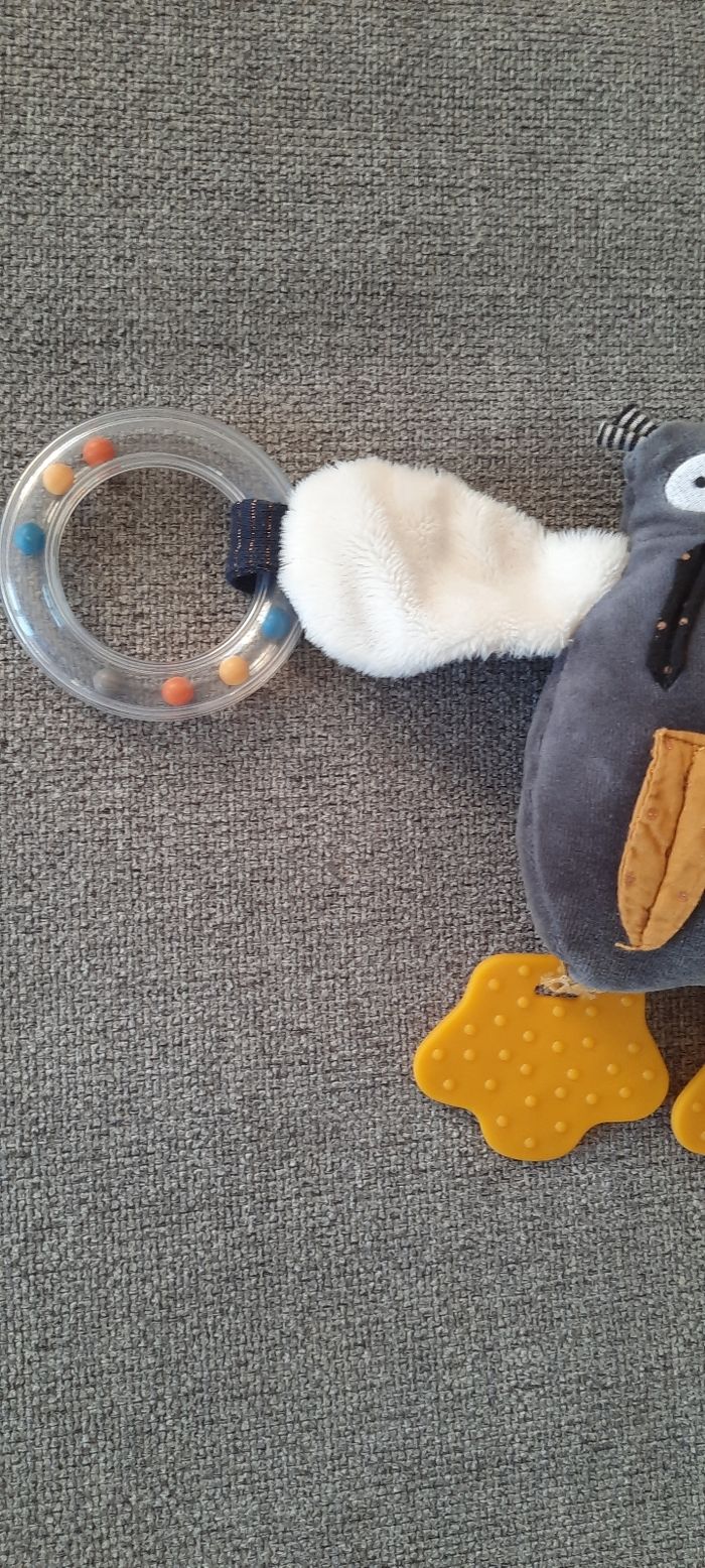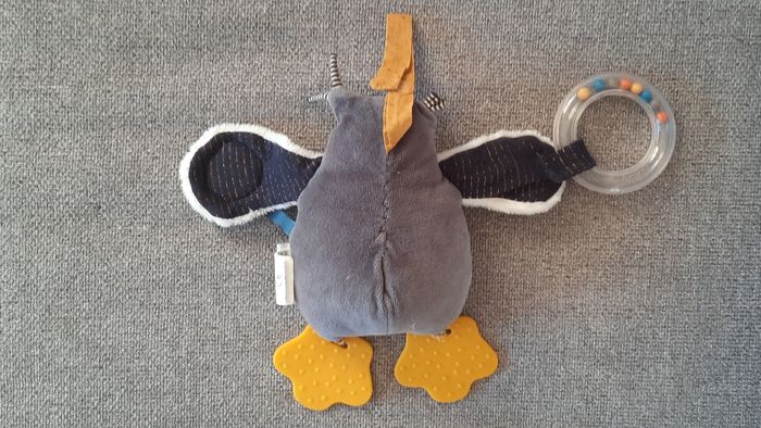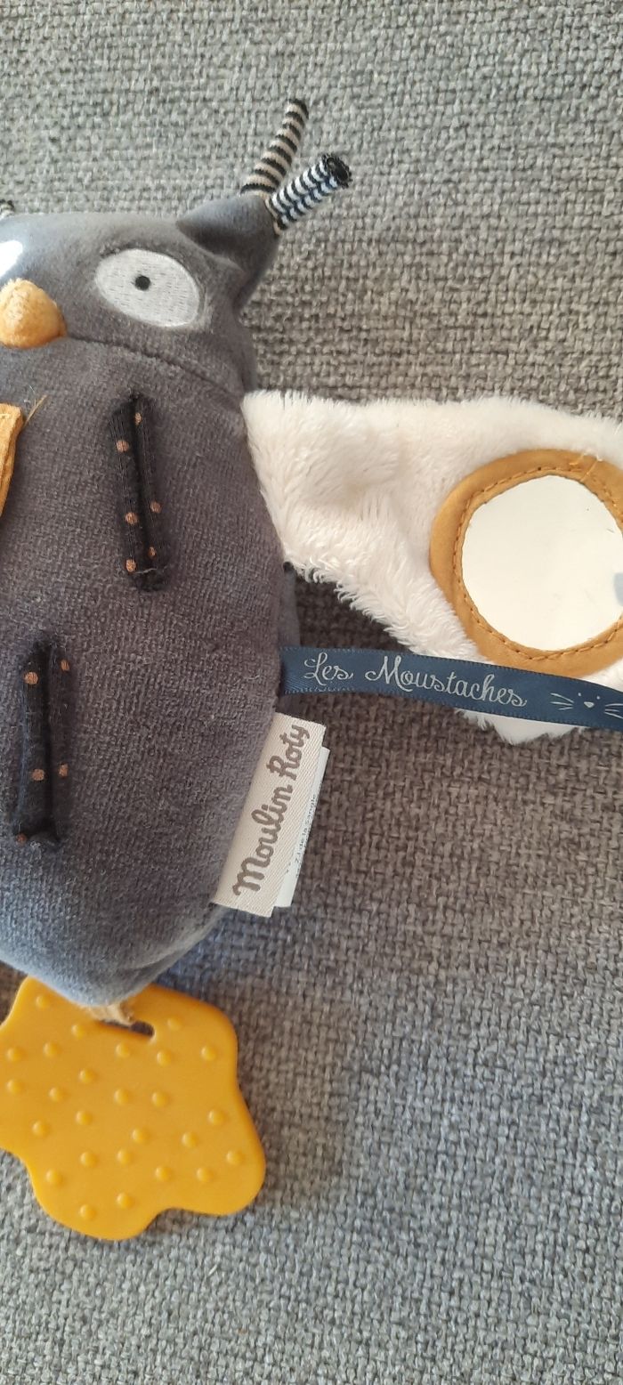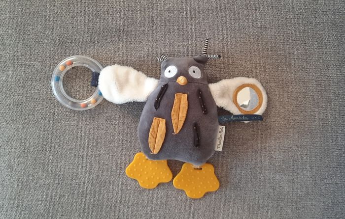 jolie peluche d'activités Peluche à suspendre Ce petit hibou est équipé d'un scratch pour vous permettre de l'accrocher. Il possède des talents incroyables : anneau avec billes, spatule dentaire, plastique qui fait du bruit, hochet, et miroir. Dimensions : 24 cm Âge : Dès la naissance Matière : Coton et polyester