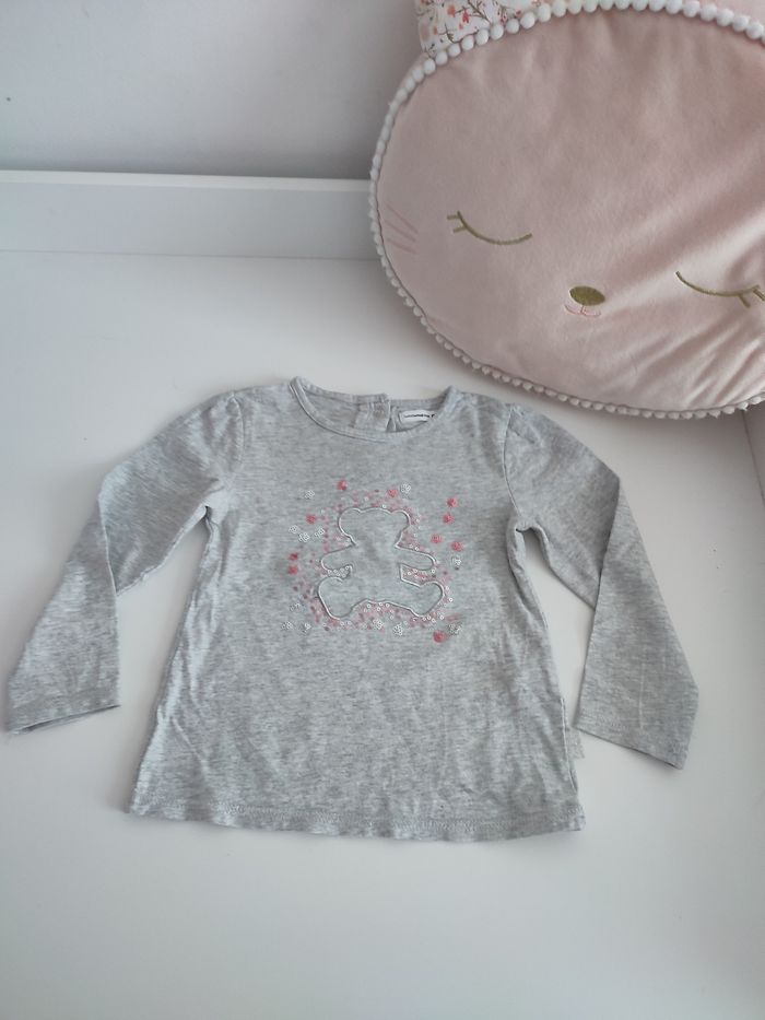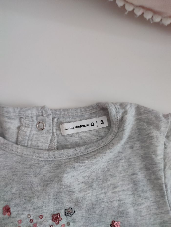 T-shirt lulu castagnette gris et rose Taille 3 ans Peu porté en très bon état Aucun défaut