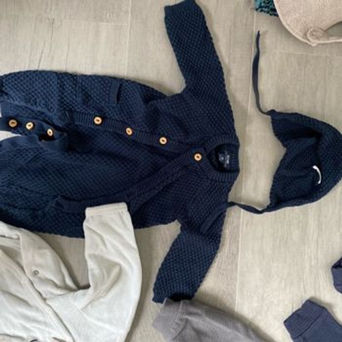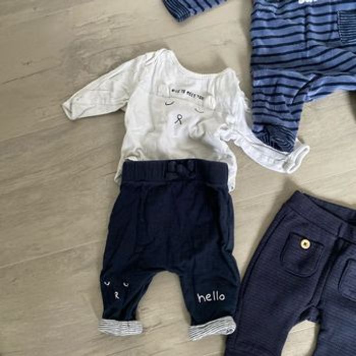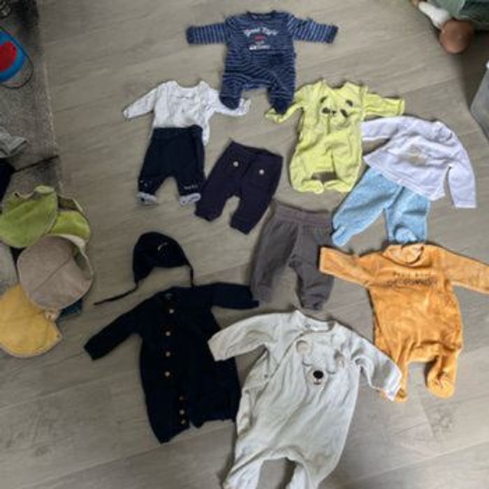 A vendre lot 1 mois avec 5 pyjamas 2 tenues complètes 2 joggings 4 bavoirs éponges plastifiés derrière Très bon etat (juste le pyjama ourson qui a une petite marque jaune de mois d’1cm qui partirait sûrement au lavage) Marques kiabi, HM