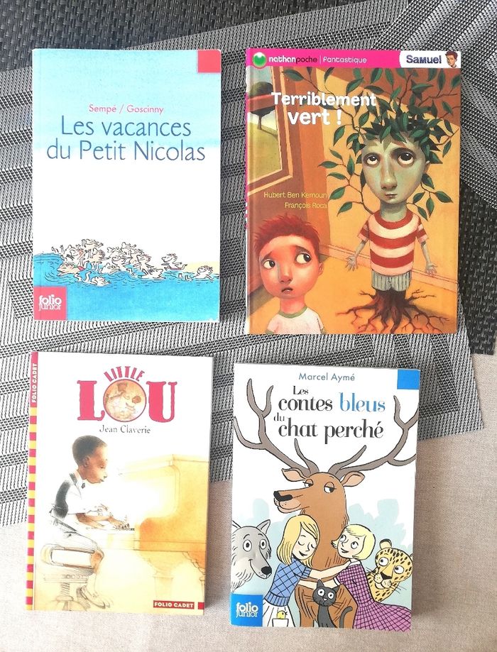 Le lot de 4 poches jeunesse - Terriblement vert poche ed. Nathan - Little lou, poche ed. Gallimard - Les vacances du petit Nicolas, poche ed. Gallimard - Les contes bleus du chat perché, poche ed. Gallimard