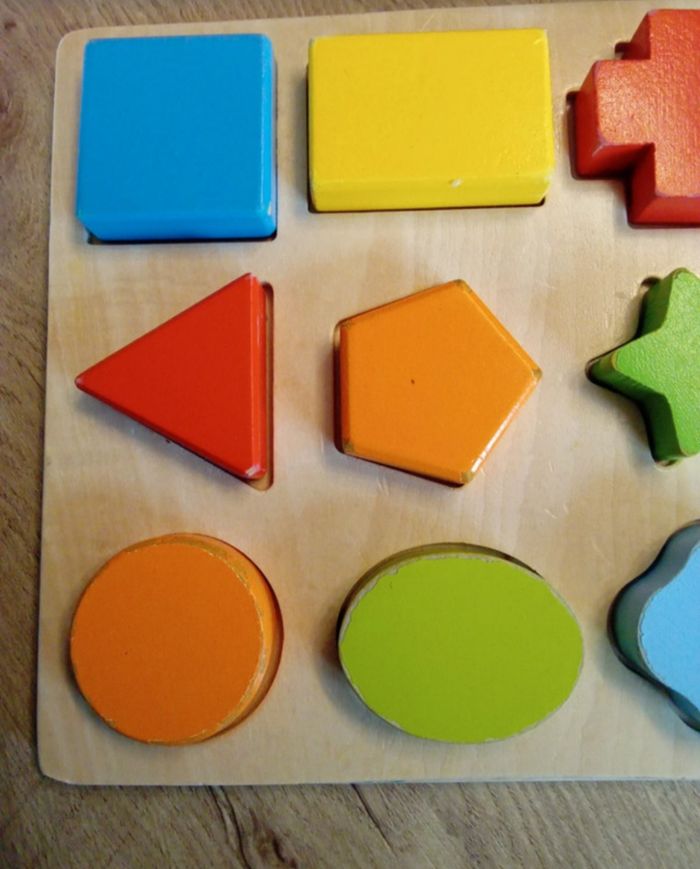 Puzzle en bois formes et couleurs Traces d'usures de manipulation sur les coins