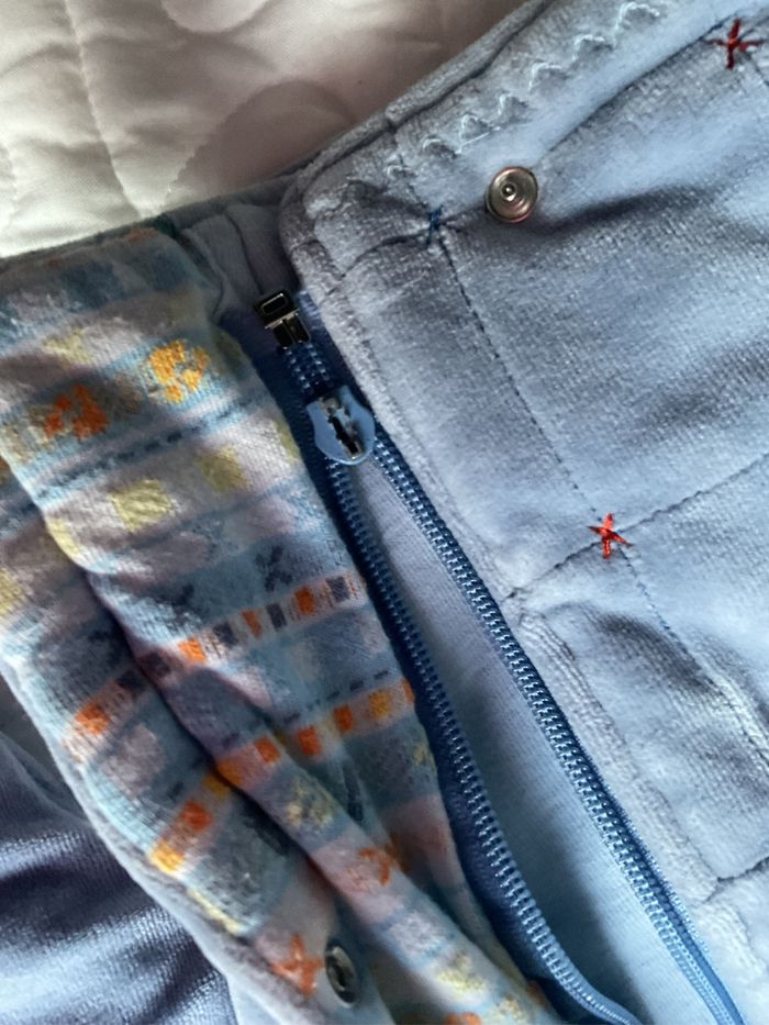 Combinaison velours. Avec capuche et moufles . Extérieur Coton et polyester. Intérieur 100% coton. Double boutonnage fermeture éclair et pression. Attache de la fermeture éclair cassée voir photo.