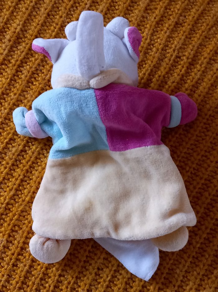 Doudou marionnette vache fushia  jaune et bleu vert avec mouchoir- Baby Nat - photo numéro 3