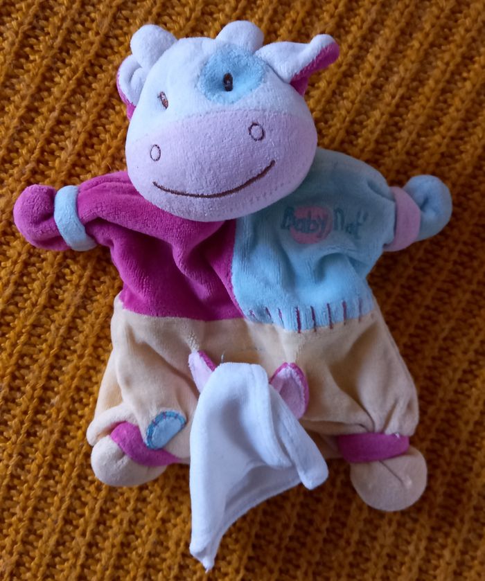 Doudou marionnette vache fushia  jaune et bleu vert avec mouchoir- Baby Nat - photo numéro 1