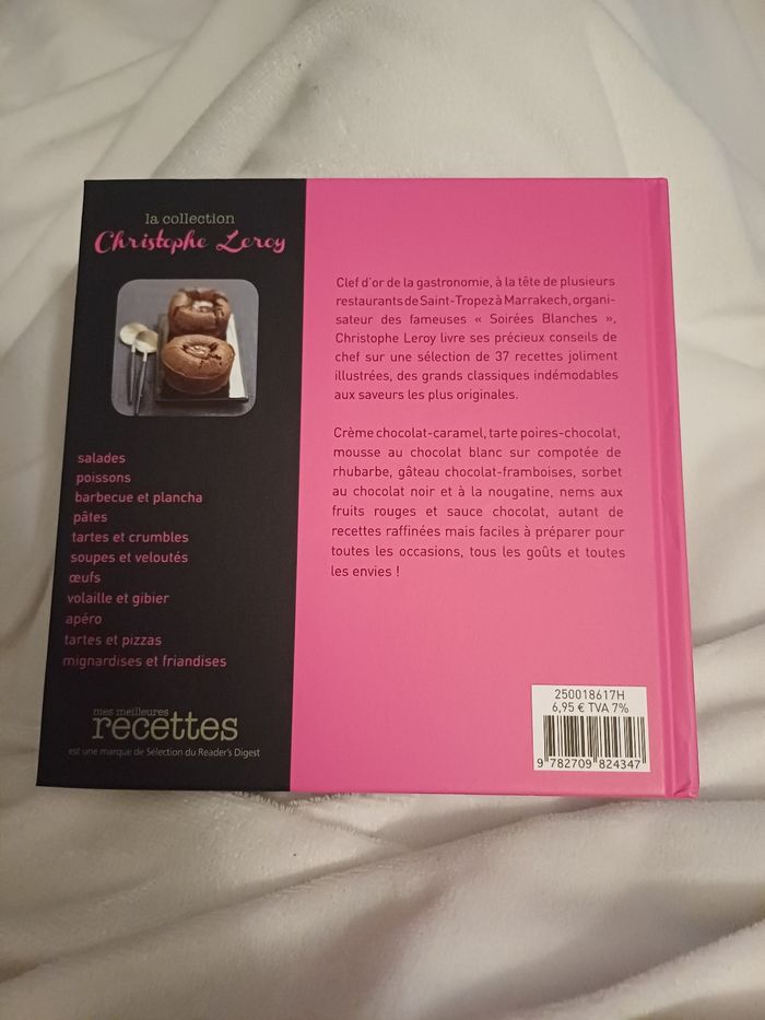 Bonjour ✴️Je vend ce livre en parfait état neuf ✴️Dans Chocolat, 37 délicieuses recettes illustrées et validées par le chef sont présentées : crème chocolat-caramel, tarte poires-chocolat, mousse au chocolat blanc sur compotée de rhubarbe, gâteau chocolat-framboises, sorbet au chocolat noir et à la nougatine, nems aux fruits rouges et sauce chocolat et bien d'autres recettes gourmandes... ✴️Autant de mets succulents et raffinés qui donneront envie aux toques débutantes ou confirmées d'adopter cette collection. ✴️Contenant 80 pages ✴️Mesurant 18cm x18cm ✴️Parution 13/09/2012 ✴️Collection de Christophe Leroy