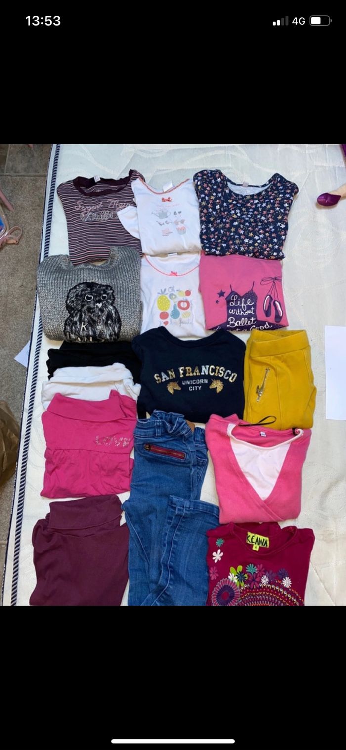 Vends lot excellent état 6 ans 3 pulls 5 t shirt manche longues 1 chemise de nuit 4 cols roulés 2 jeans 15 articles et J’offre une veste avec ce lot