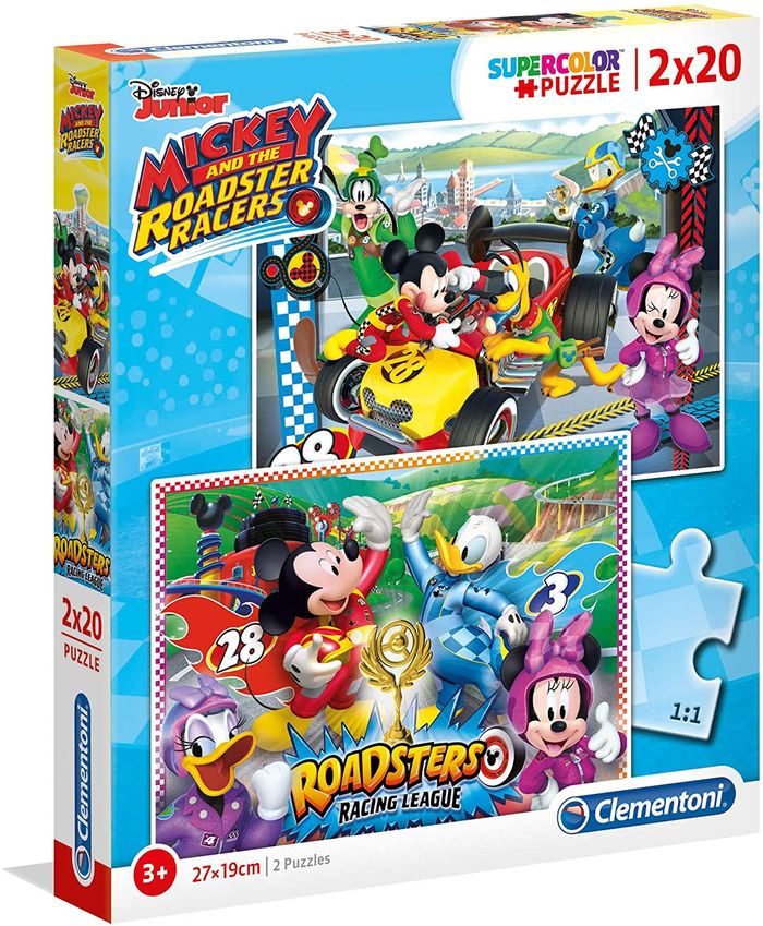 Clementoni puzzle Supercolor Mickey and The Roadster Racers 2 x 20 pièces 07034 2 Puzzles 2x20 pièces de dimensions 27x 19 cm. La collection SuperColor, dédiée aux enfants, propose de nombreux puzzles à l'image des héros préférés des enfants. La variété des images colorées et les différents nombres de pièces permettent à chacun de s'amuser et de développer ses capacités de logique et d'observation. NE CONVIENT PAS AUX ENFANTS DE MOINS DE 3 ANS !!