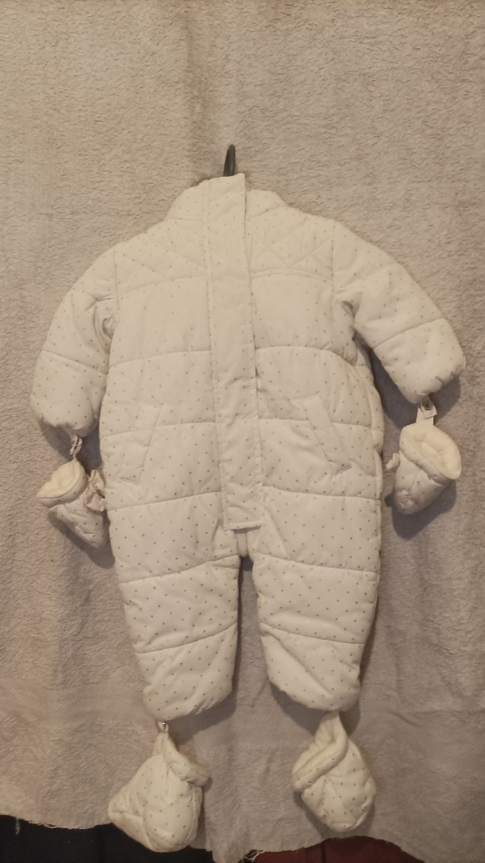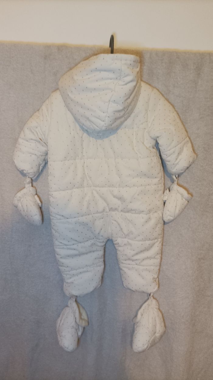 Combipilote assez épaisse blanche a poids gris, taille 3-6 mois, capuche, gants et chausson intégrés avec possibilité de les retirer. Tout les articles peuvent être ajoutés a des lots, tout les lots sont modifiables et négociables.