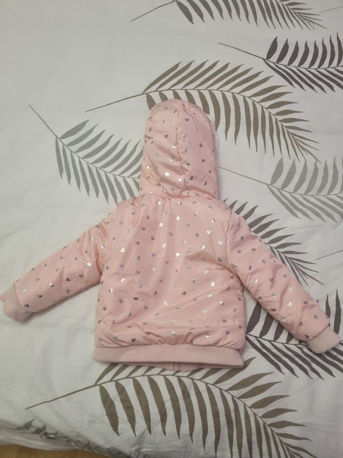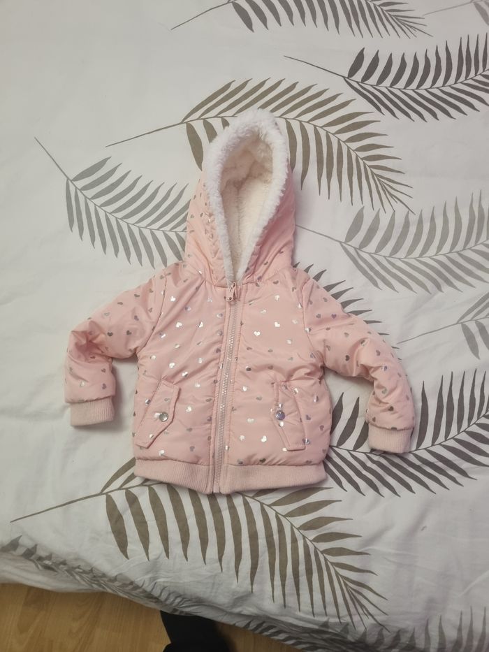 Jolie doudoune rose avec motifs petits cœurs argentées , veste réversible. Taille 12 mois Très bon état