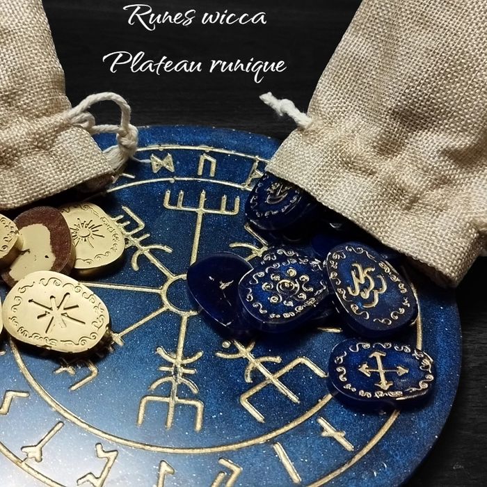 Set complet de deux jeux de runes wicca et plateaux runiques Valeur 70€ Vendu avec livret de tirage Plateau 28cm de diamètre