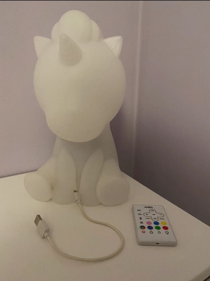 Enceinte qui fonctionne en Bluetooth, usb et port aux. Elle sert aussi de veilleuse avec plusieurs couleurs. Elle a une télécommande pour pouvoir changer de couleur, d'intensité, lumière ou de musique à distance. J’ai le carton, idéal pour offrir à noël.