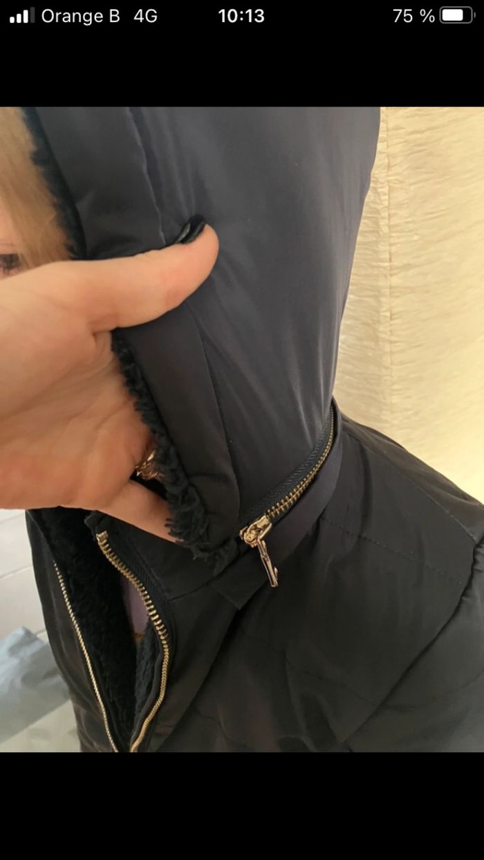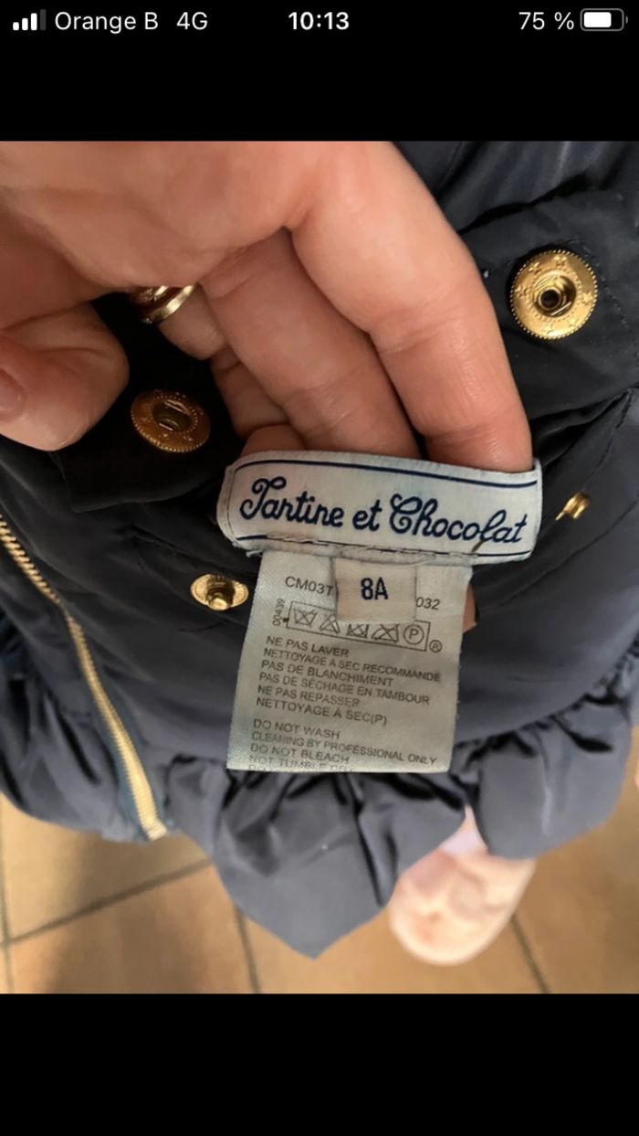 Doudoune hiver réversible. Doudoune bien chaude pour l’hiver à deux côtés. Taille : 8 ans Couleur : bleu foncé Marque : tartine et chocolat Un petit défaut (voir dernière photo) qui était déjà là à l’achat. Ça ne se voit pas porté, ma fille la portée 1 hiver et n’a pas bougé. En parfait état Prix d’achat : 200€ Prix de vente : 65€ discutable