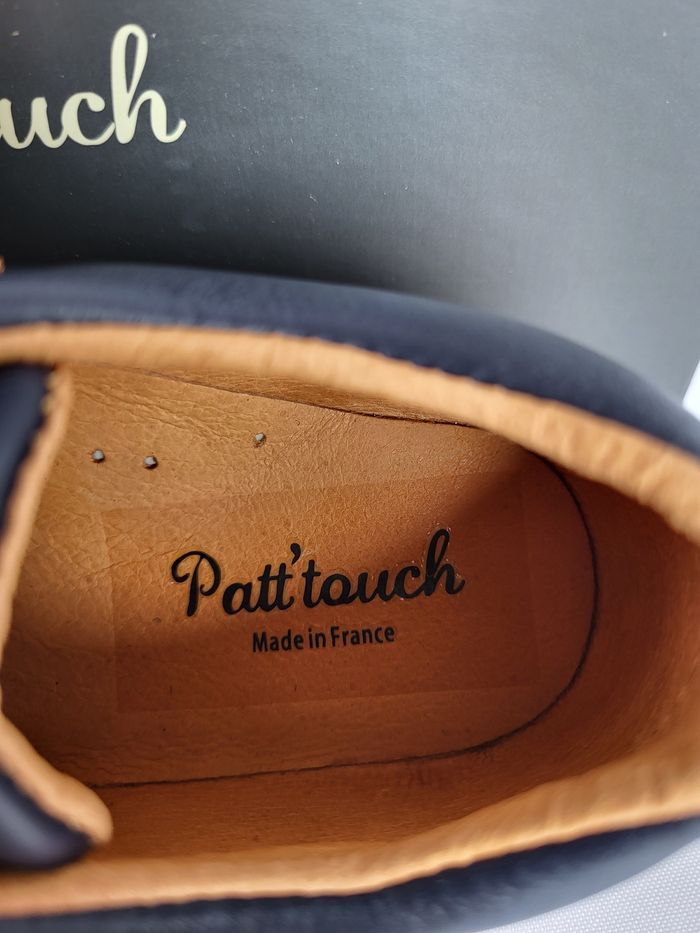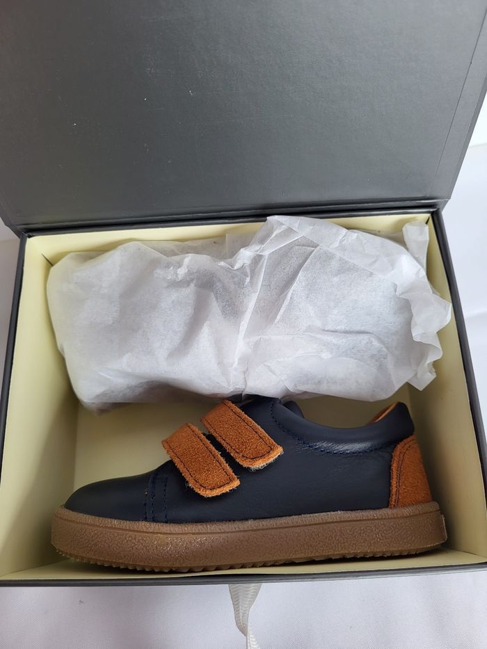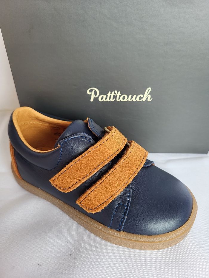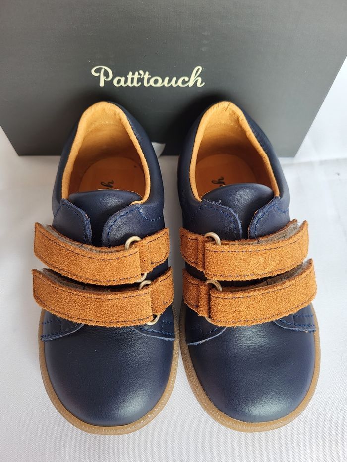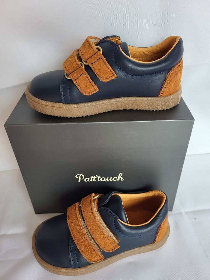 Chaussures enfants de style tennis, de très belle qualité, de la marque PATT'TOUCH Dessus tout en cuir lisse souple marine et croûte velours brique, doublure et semelle intérieure en cuir beige, semelle extérieure en caoutchouc, souple et légère, fermeture brides velcro ajustables Fabrication 100% Française dans un atelier familial près de Bordeaux Dimensions de la semelle intérieure : longueur 14.5 cm largeur 5.4 cm Emballage d'origine en coffret gris avec ruban écru au nom de la marque Déstockage à prix cassés, idéal pour offrir ou se faire plaisir ! Neuves, jamais portées Taillent normalement Envoi rapide et soigné