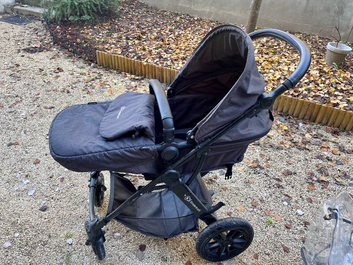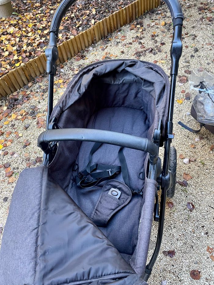 Poussette tous terrains. Elle est légère, très maniable et facilement pliable. Elle est vendue avec; - châssis - nacelle qui évolue en siège assis lorsque votre enfant grandit ( très confortable avec petit matelas supplémentaire) - cosy - bâche de pluie - bâche protection soleil - réducteur pour cosy supplémentaire - sac à langer Quelques rayures sont à noter sur le cosy
