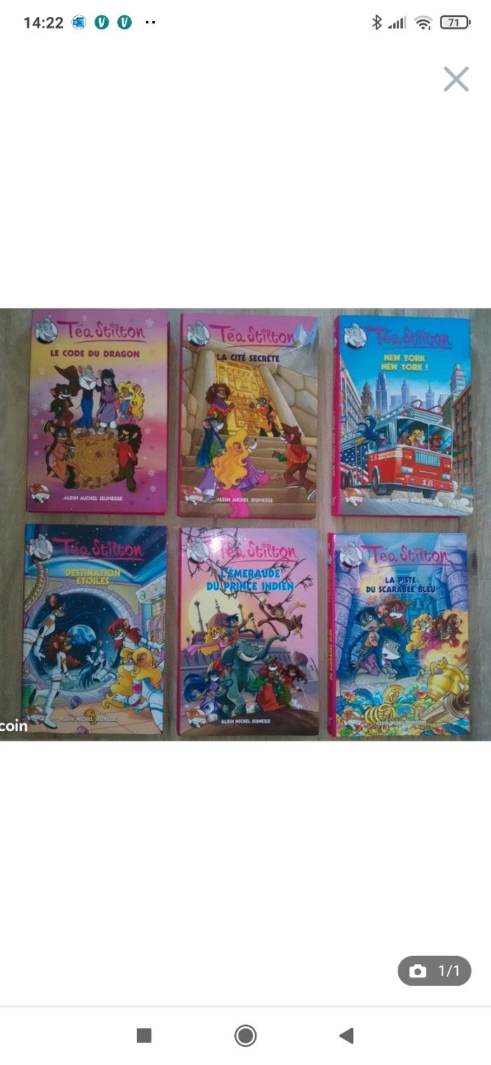 Téa Stilton - Tome 1 - Le Code du dragon Téa Stilton - Tome 3 - La Cité secrète Téa Stilton - Tome 6 - New yor New York ! Téa Stilton - Tome 8 - Destination étoiles Téa Stilton - Tome 11 - La Piste du Scarabée bleu Téa Stilton - Tome 12 - L'émeraude du prince indien Très bon état Ce sont les gros livres, pas les petits. Environ 200 pages par livre.