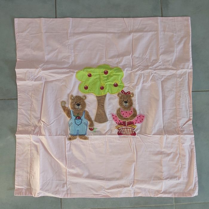 Taie d'oreiller coton de qualité carrée motif ourson neuve. Petite trace de stylo très peu visible sur la partie verte.