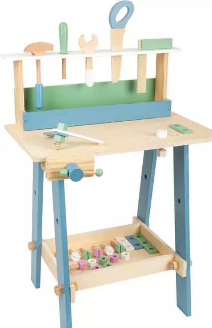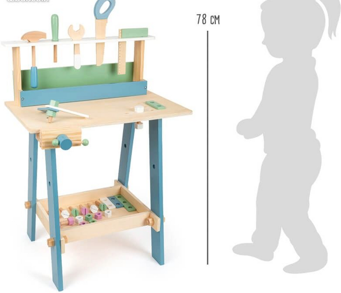 DESCRIPTION Des couleurs douces, des formes présices, des matériaux naturels, voilà le design nordique! Avec ce robuste établi en bois, garçons et filles apprennent leurs premières activités de bricolage de manière ludique. Les 5 outils différents et les 24 accessoires forment également la motricité fine. Étau inclus. Accessoires composés de 9 vis, 9 écrous et 6 bandes perforées. Les enfants peuvent déjà aider à la construction et prouver leurs compétences manuelles. Grâce à son design scandinave aux couleurs discrètes, cet établi convient à tout type d'ameublement. Pour les filles aussi bien que pour les garçons un jouet de jeu de rôle approprié. avec pince à vis et 5 outils en bois (équerre de charpentier, scie, tournevis, clé à molette, marteau) avec une large gamme d'accessoires comprenant des bandes perforées, des vis et des écrous Des espaces de rangement fixes pour les outils et les accessoires permettent de garder les choses en ordre offre un espace de stockage suffisant enseigne de manière ludique le maniement des outils et une première compréhension de base de technique entraîne la motricité fine et globale ainsi que la coordination main-œil design non genré des couleurs douces dans un style scandinave avec beaucoup de bois visible CARACTÉRISTIQUES Dimensions: env. 53 x 40 x 74 cm, hauteur de jeu env.ca. 54 cm Matériel: bois Âge recommandé: 3+ Poids, emballage inclus: 4,97 kg Tous mes prix sont négociables Alors lancez vous ! Que risquez vous?