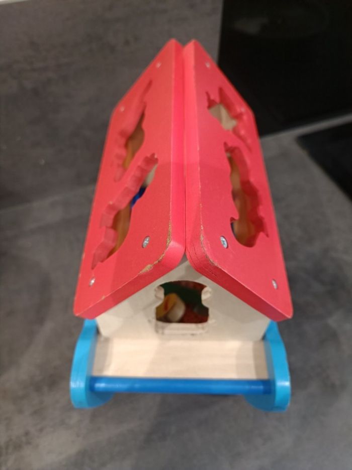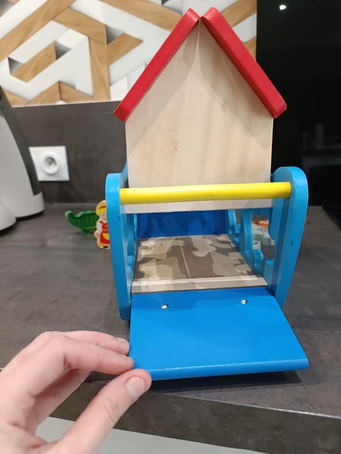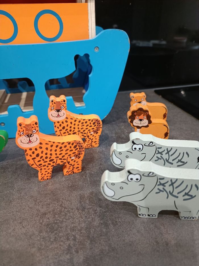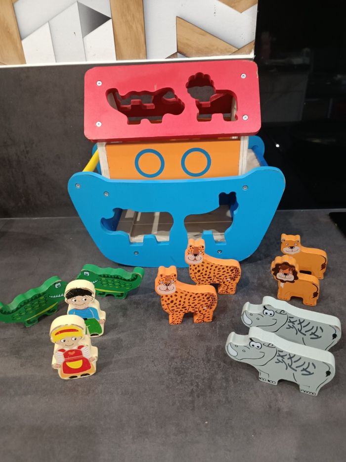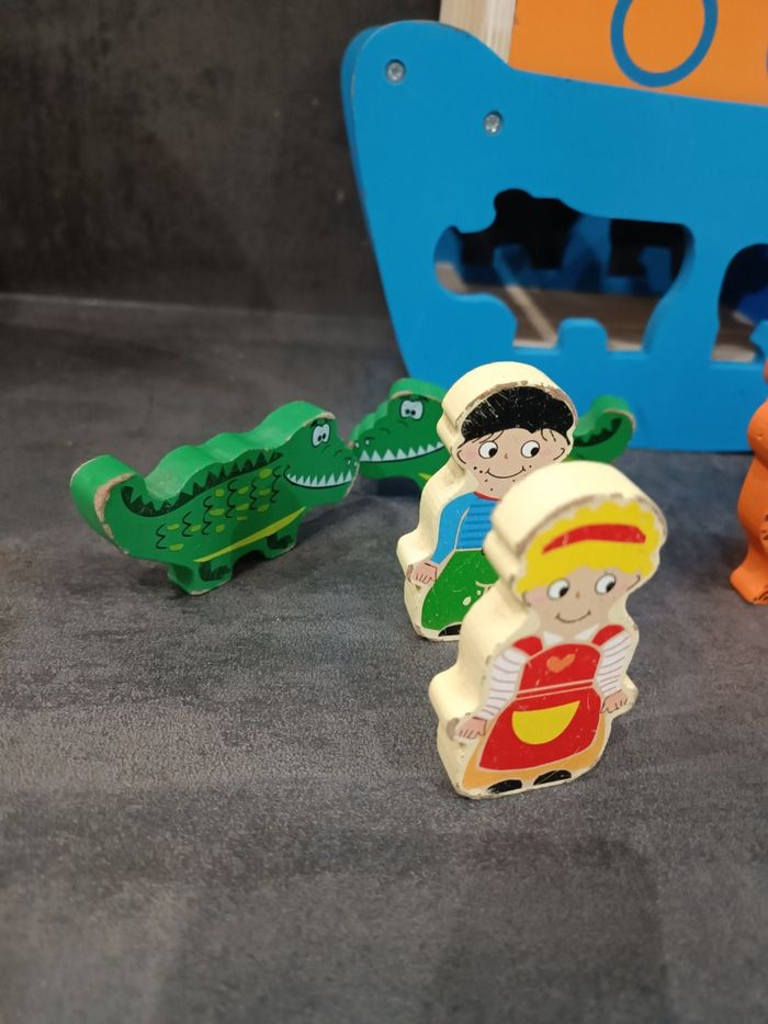 Arche de Noé en bois complet Avec traces d'usures sur les personnages et le bateau Jeu d'encastrement La porte du bateau s'ouvre et se referme également