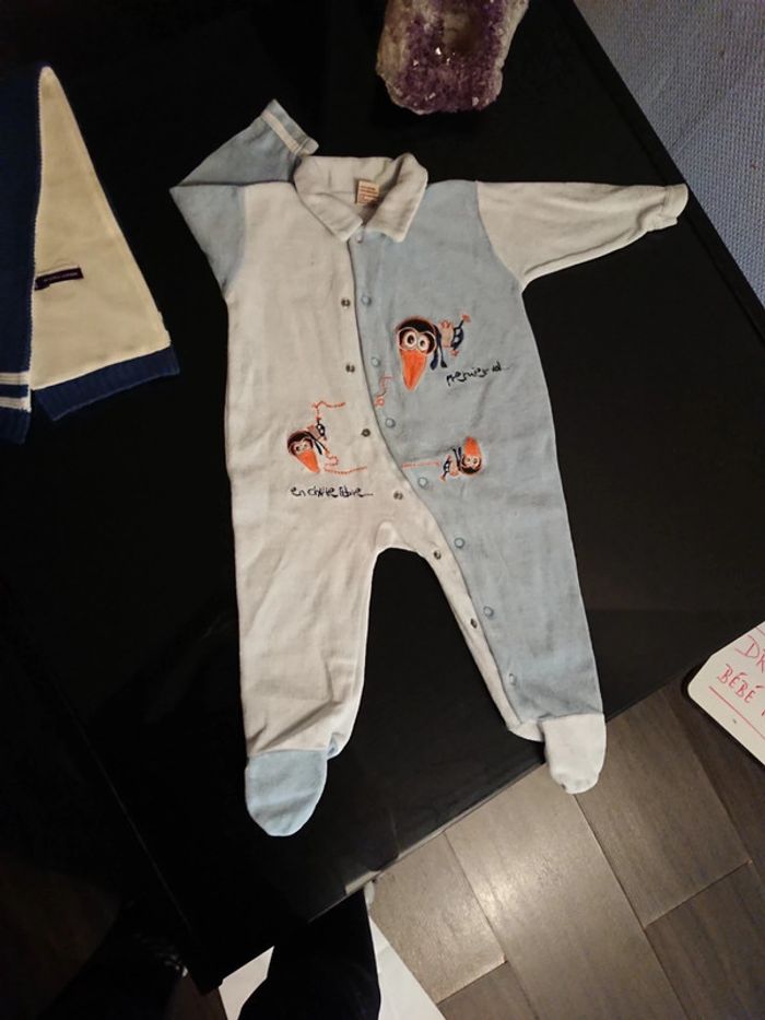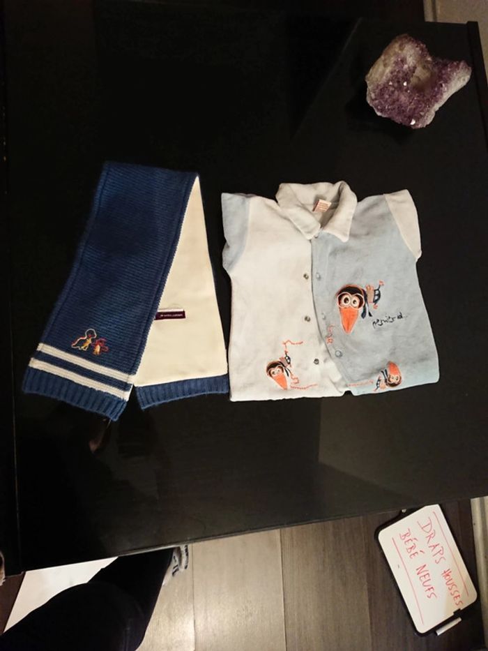 Lot pyjama 6 mois en bon état, pas de trou de tâches ou de problème avec les boutons pressions, de couleur blanc et bleu claire. 1 écharpe de chez Sergent Major en excellent état, bleu marine et blanche, hyper douce à l'intérieur et laine sur l'extérieur. N'hésitez pas à me demander si vous souhaitez composer votre lot ou si vous avez des questions j'y répondrais avec plaisir :) #ensemblebebe #lotvetementsbebe6mois #echarpebebe #pyjamabébé
