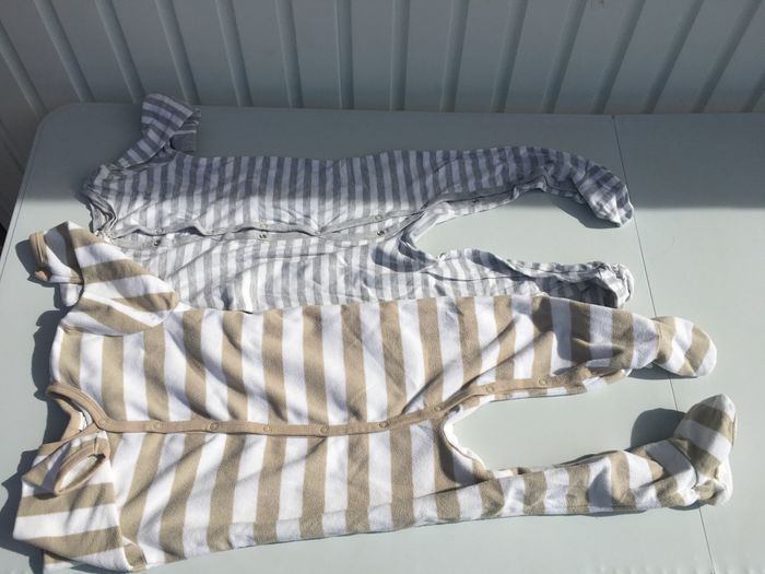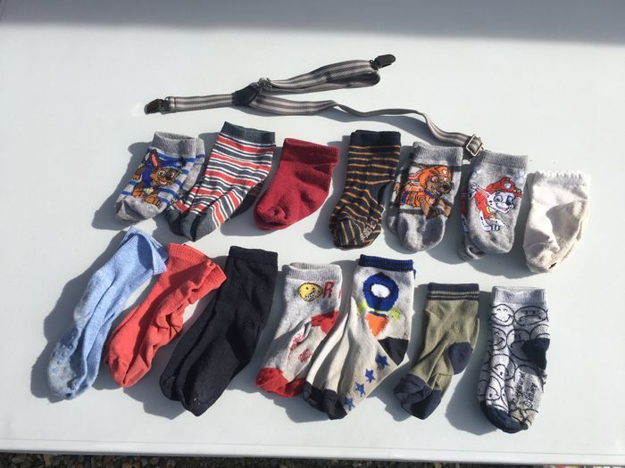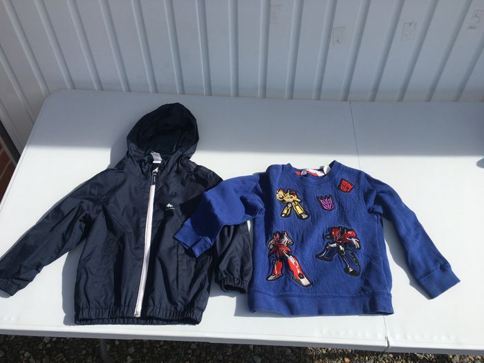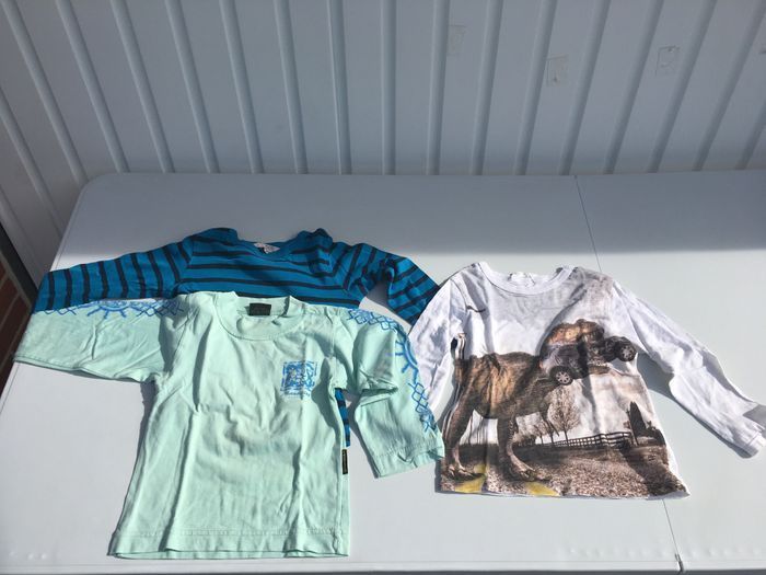 Photo 1 : 2 gilets chauds à capuche (marque Orchestra pour le rouge, marque non connue pour l’autre). Photo 2 : 2 gilet ; le bleu-gris de type tricot (H&M), le blanc de type polaire (Quechua) Photo 3 : un coupe-vent (Quechua) et un pull (H&M) Photo 4 : 3 T-shirts à manches longues (marque H&M pour le T-shirt bleu rayé et le t-shirt dinosaure, marque non connue pour le vert). Photo 5 : 6 T-shirts à manches courtes (marques Vert Baudet, Décathlon, Absorba et Hugo Boss). Photo 6 : 2 Pyjama combinaison ; dont un pyjama chaud (marque H&M pour les 2). Photo 7 : 14 paires de chaussettes et une paire de bretelles. Photo 8 : un pyjama 2 pièces (H&M). 34 vêtements
