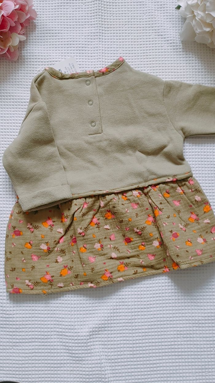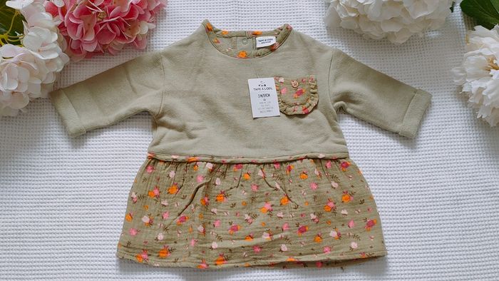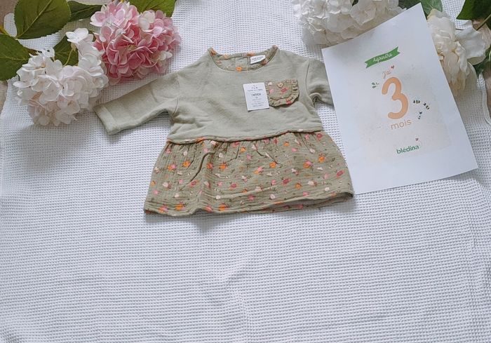 Bonjour, je vends : * cette robe bi matière, très jolie ☘️ taille 3 mois 📜Marque "Tape à l'oeil" 🌸Neuve avec étiquette 🌈 6 euros