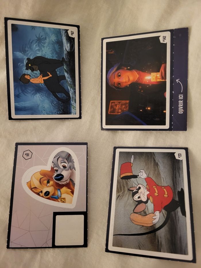 4 autocollants Disney 100 Auchan 2023 1 carte n°23 1 carte n°142 1 carte n°51 1 carte n°67 Attention il n'y a plus la vignette en bas