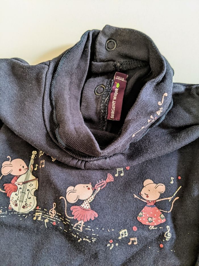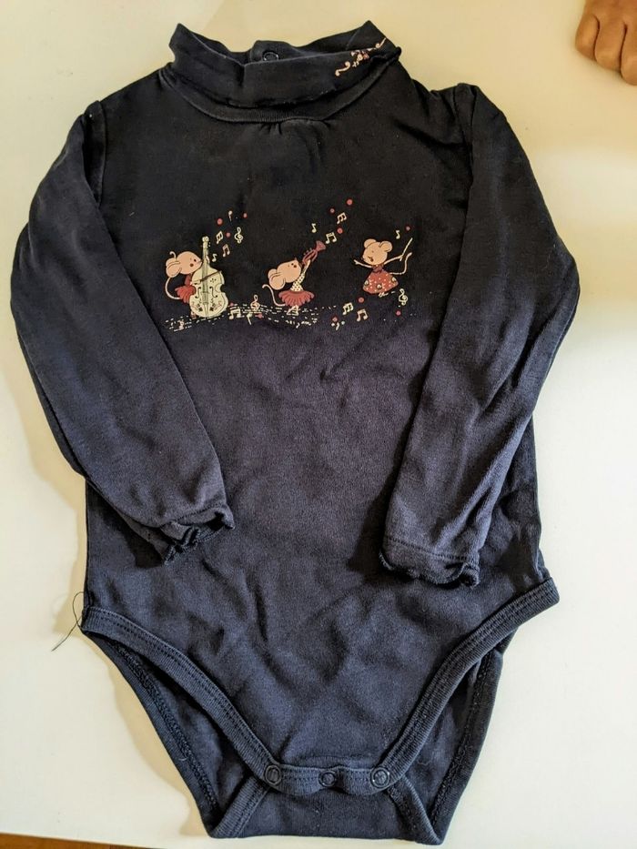 Body manches longues Sergent major 18 mois 81 cm Coton moyennement épais Bleu marine col roulé Ouverture dos par boutons pression Thème petites souris qui dansent Très bon état #yipin_bebe_18mois #yipin_bebe_18mois_fille