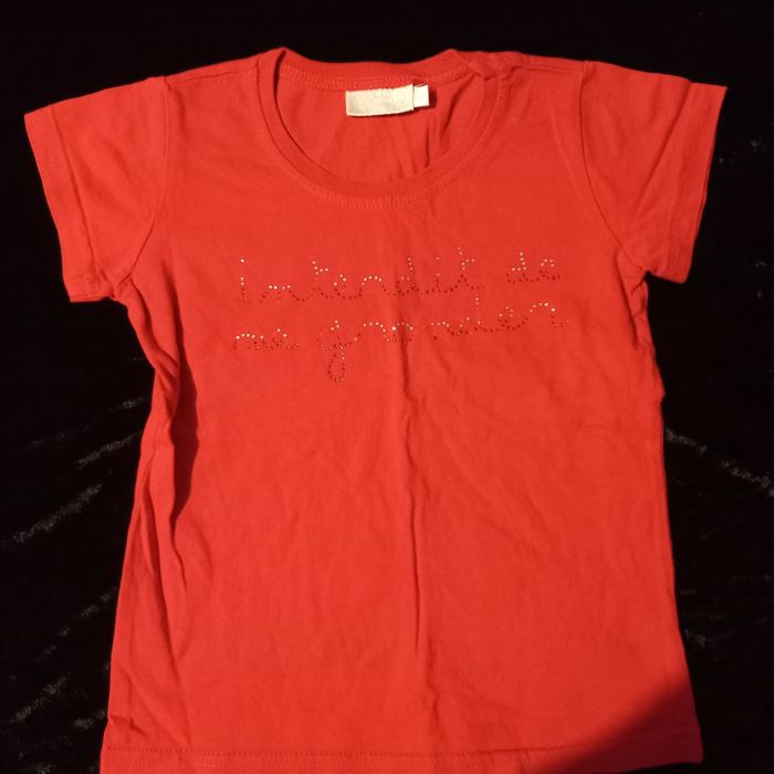 T-shirt pour enfant 4 ans ,en très bon état couleur rouge, manches courtes, marque interdit de me gronder .