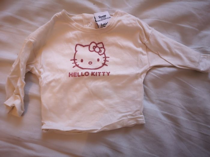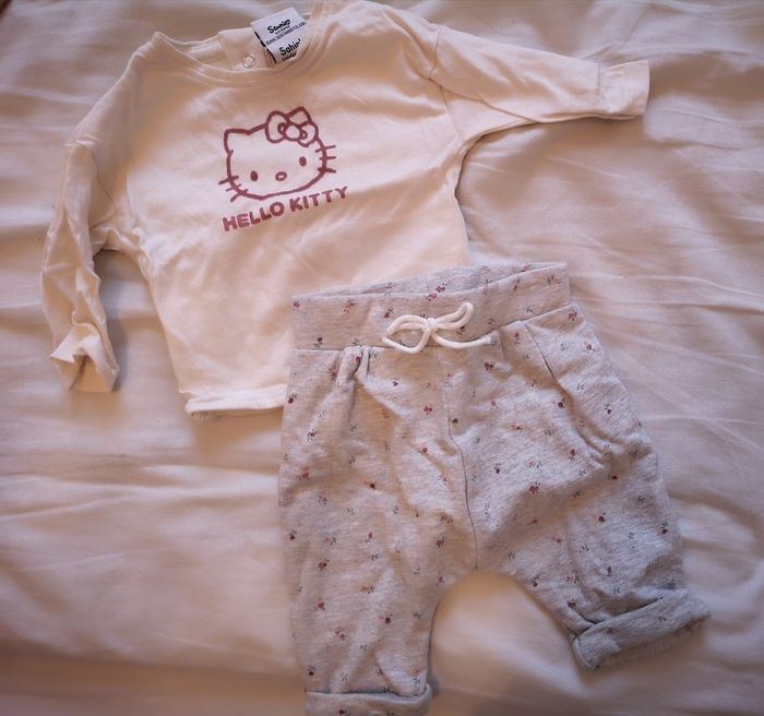 Composé d'un t-shirt manches longues écru hello kitty + un pantalon chaud doublé molleton gris, imprimé fleurs