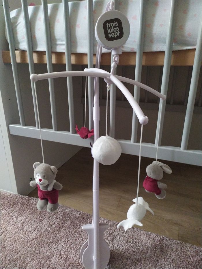 Jouet d'éveil bébé sur support mobile avec musique a accrocher sur le lit Jamais servis Neuf (Marque : Trois kilos sept) rouge et gris