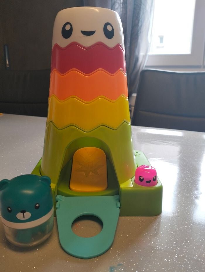 Pyramide d'emboîtement musicale et lumineuse (la petite tête rose au pied de la pyramide). Piles encore fonctionnelles à l'intérieur.