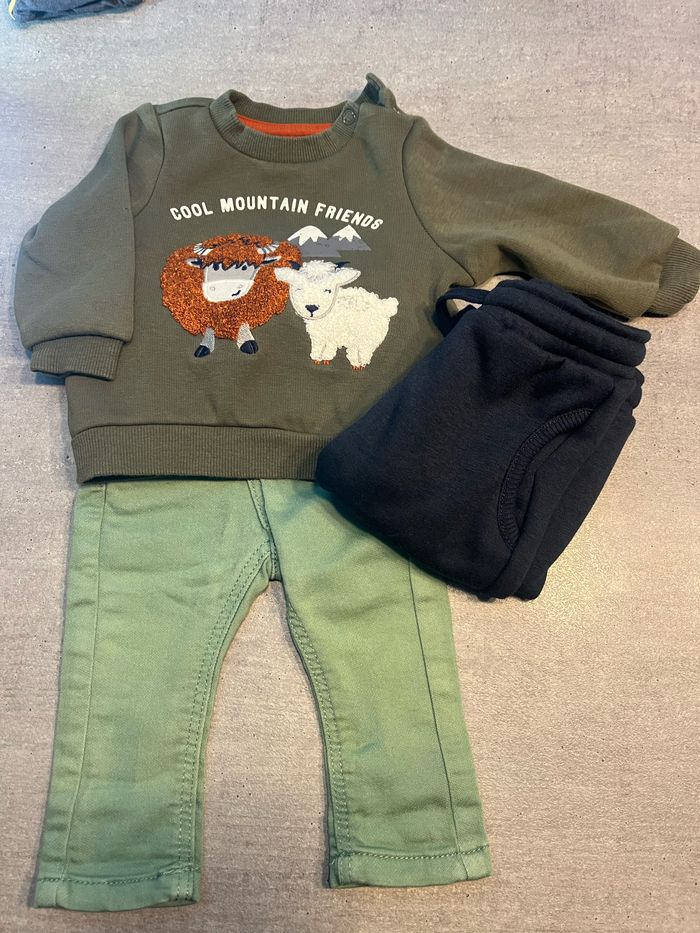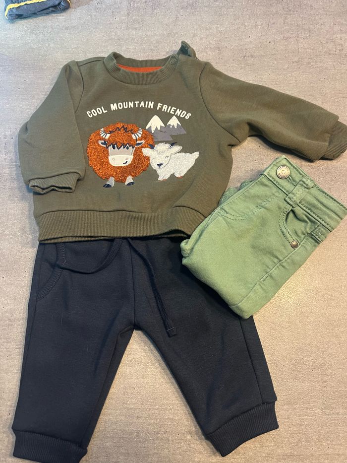 Ensemble doté d’un pull CA, d’un pantalon Tape à l’œil et d’un autre pantalon Kiabi . Le tout est en 3 mois et en parfait état.