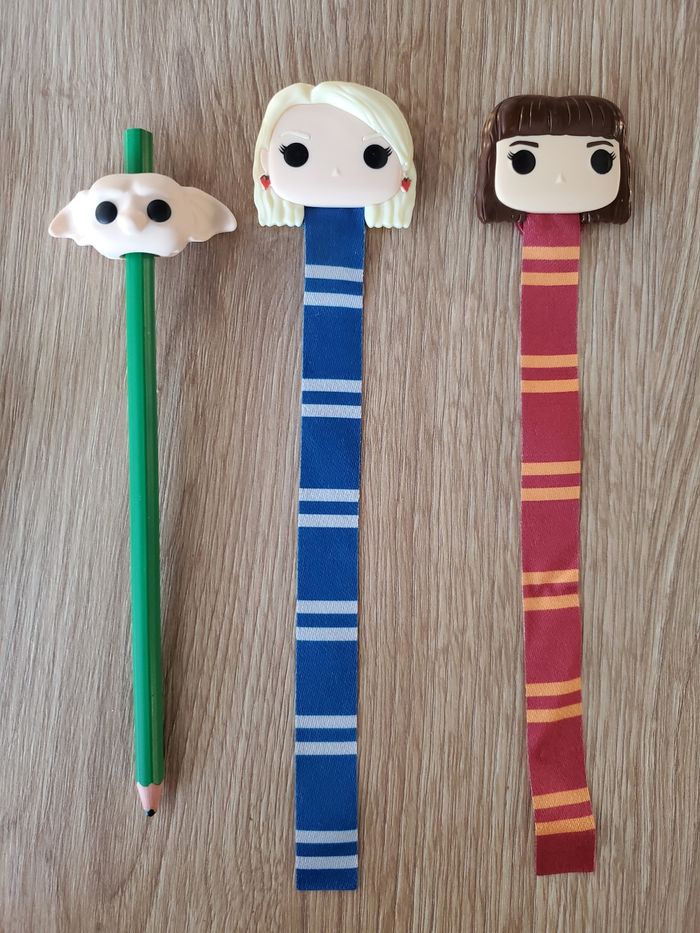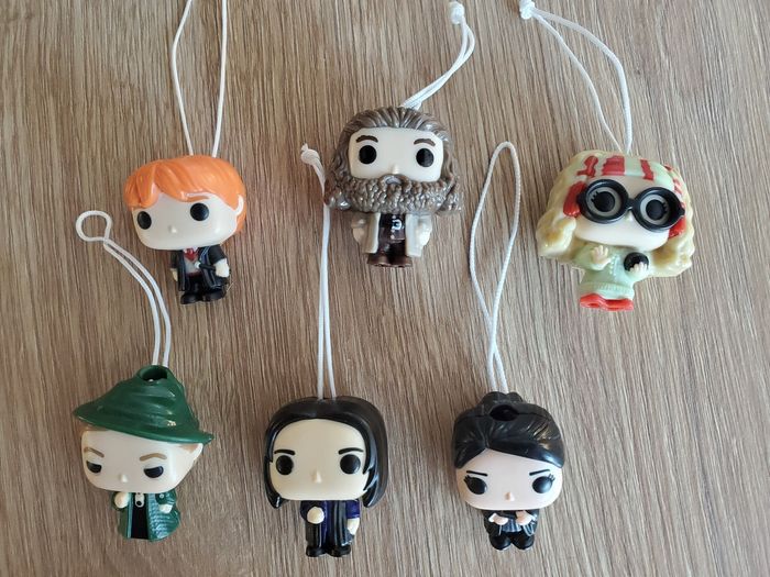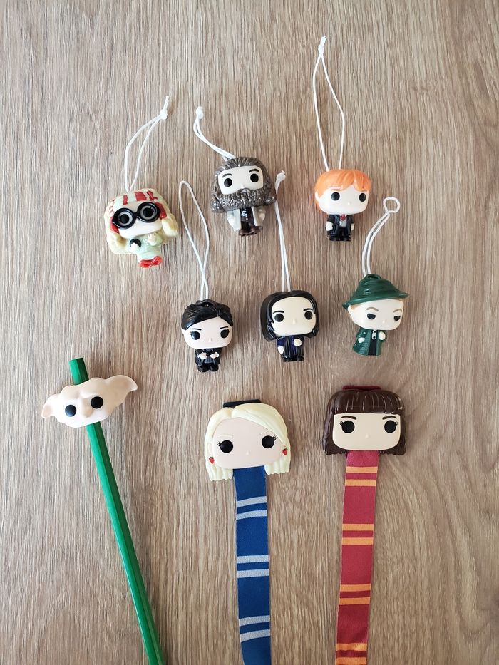 Lot de 9 petits objets sur le thème de Harry Potter. 6 figurines, 1 embout à crayon, 2 bracelets.