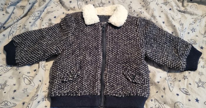 Veste aviateur bleue marine et blanche chinée. Très bon état. Col en moumoute douce. 9 mois.