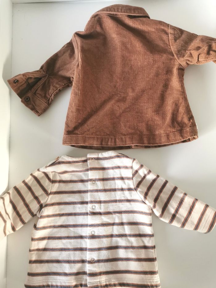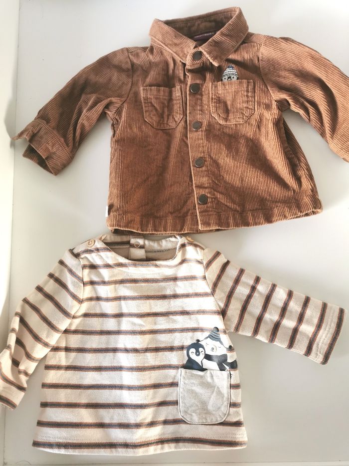 En excellent état taille 6 mois, veste en velours et t shirt chaud.