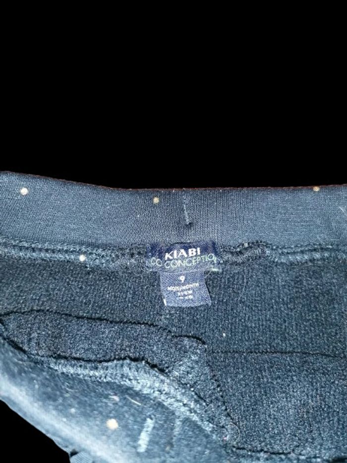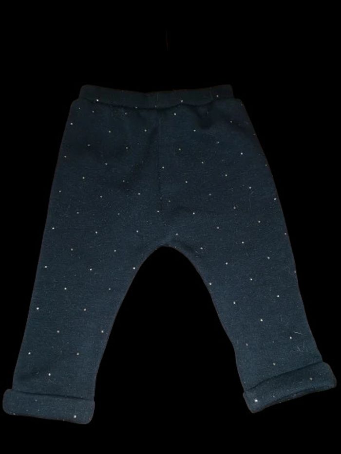 pantalon molleton bleu marine avec petits strass gris sur les jambes, taille élastique, petit nœud décoratif sur le devant, quelques bouloches , de taille 9 mois fille , marque KIABI , état satisfaisant #9moislasticouette74360