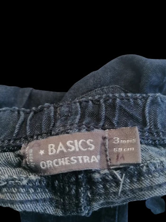 jeans couleur bleu avec ouverture pression et taille élastique de marque ORCHESTRA taille 3 mois garçon bon état
