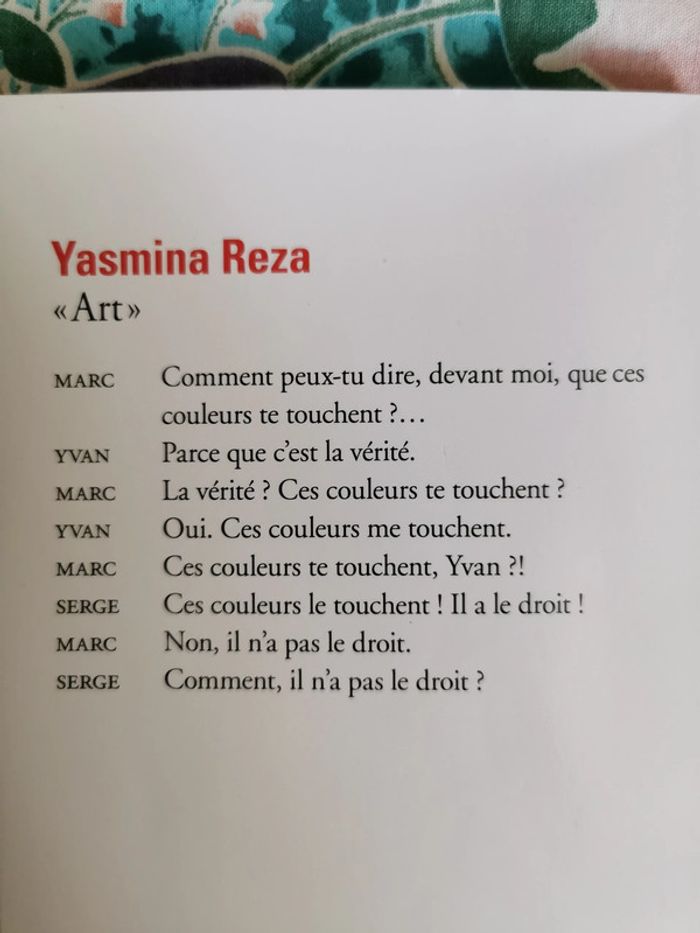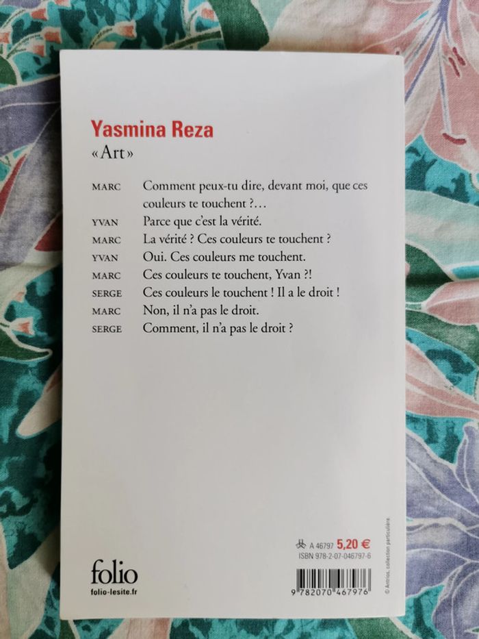" #Art " de Yasmina #Reza pièce de théâtre « Mon ami Serge a acheté un tableau. Un #tableau #blanc avec des liserés blancs ». Médecin dermatologue, Serge aime l'art #moderne et #Sénèque - qu'il trouve "modernissime". Ingénieur dans l'aéronautique, Marc a des goûts plus traditionnels et ne comprend pas que son ami puisse acheter "cette merde" deux cent mille francs. Quant à Yvan, il aimerait bien ne contrarier aucun de ses deux précieux amis. Mais les disputes esthétiques autour du tableau blanc dégénèrent dans un crescendo hilarant et féroce qui ne laissera personne indemne... edition #folio 128 pages #ed3livreenfantenfrançais Educatif, apprentissage, livres
