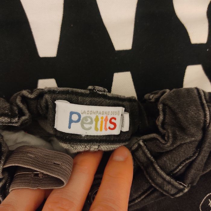 Jean noir 12 mois. La compagnie des petits. Motifs rigolos sur le devant du jean.