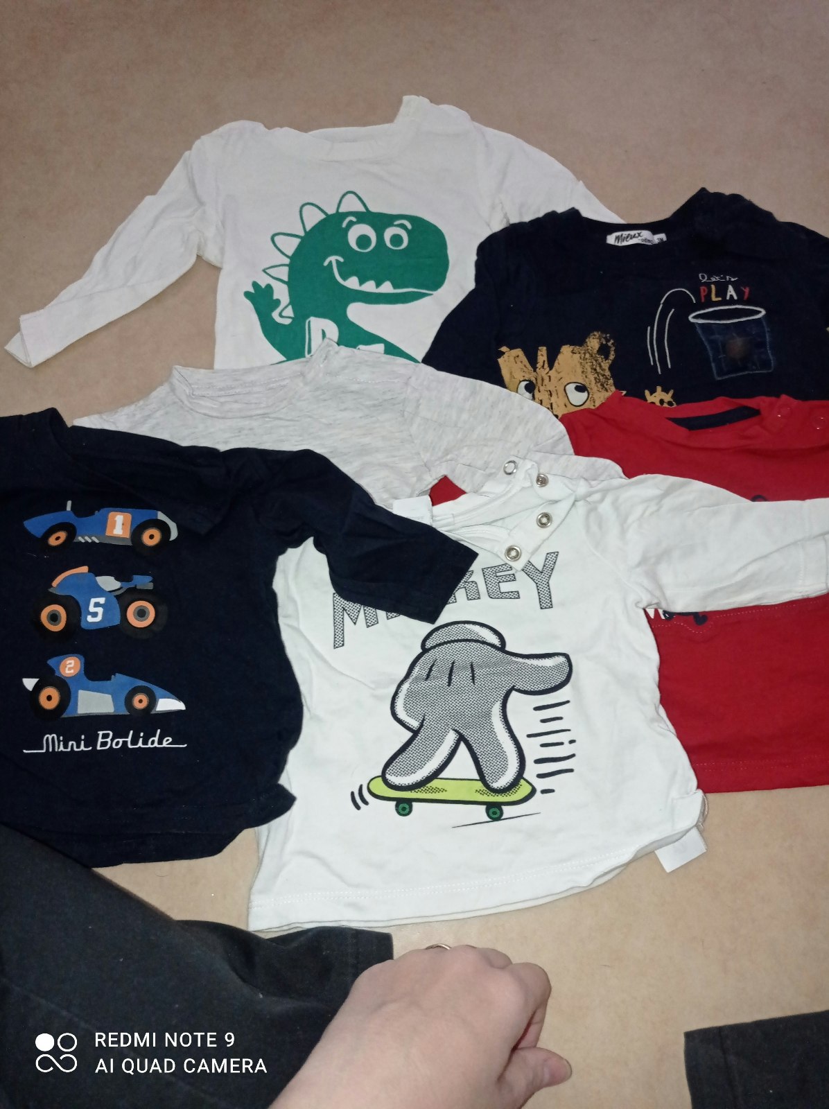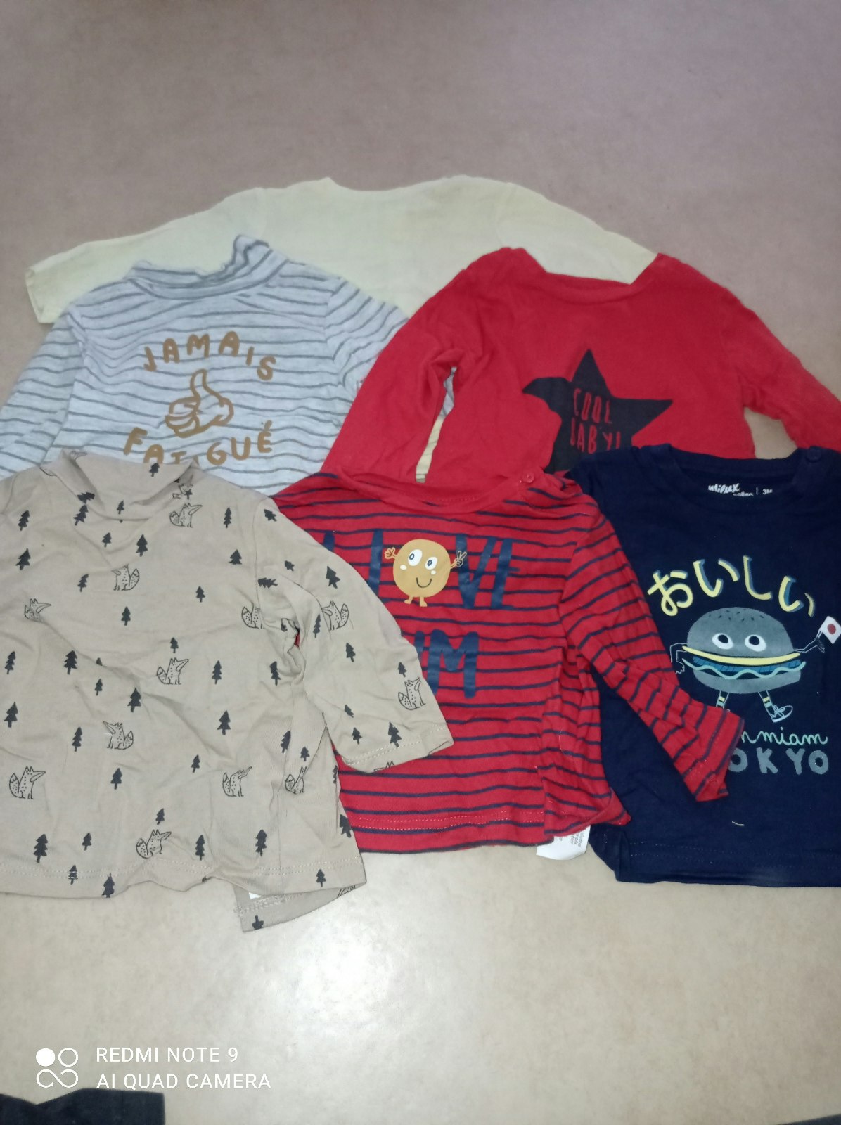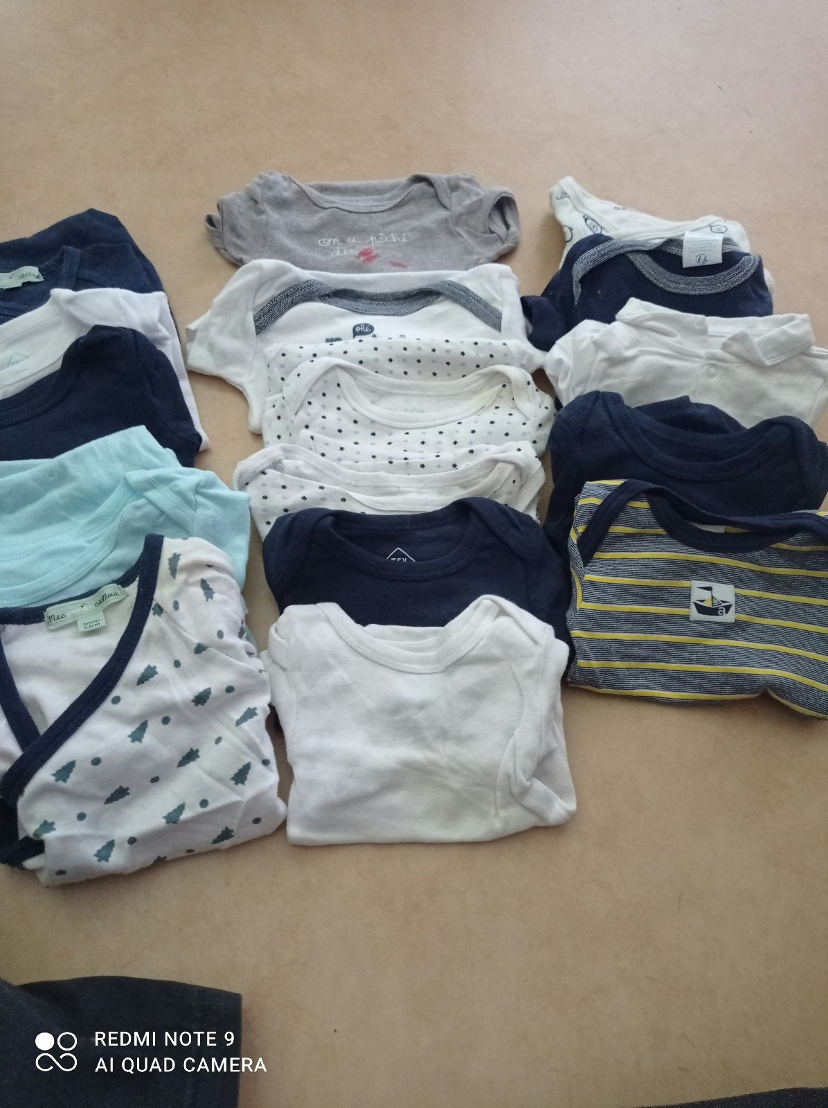 Lots de vêtements 20 pantalons 21 t-shirts manches longues 6 t-shirt manches courtes 6 vestes 2 manteaux 10 pulls 1 chemise 5 pyjamas 19 bodys 1 salopette..... Taille 3 mois Plusieurs marques ( Gémo, sergent major, la halle, baby Disney,....) Certains sont neuf Petites Chaussures bébé offertes