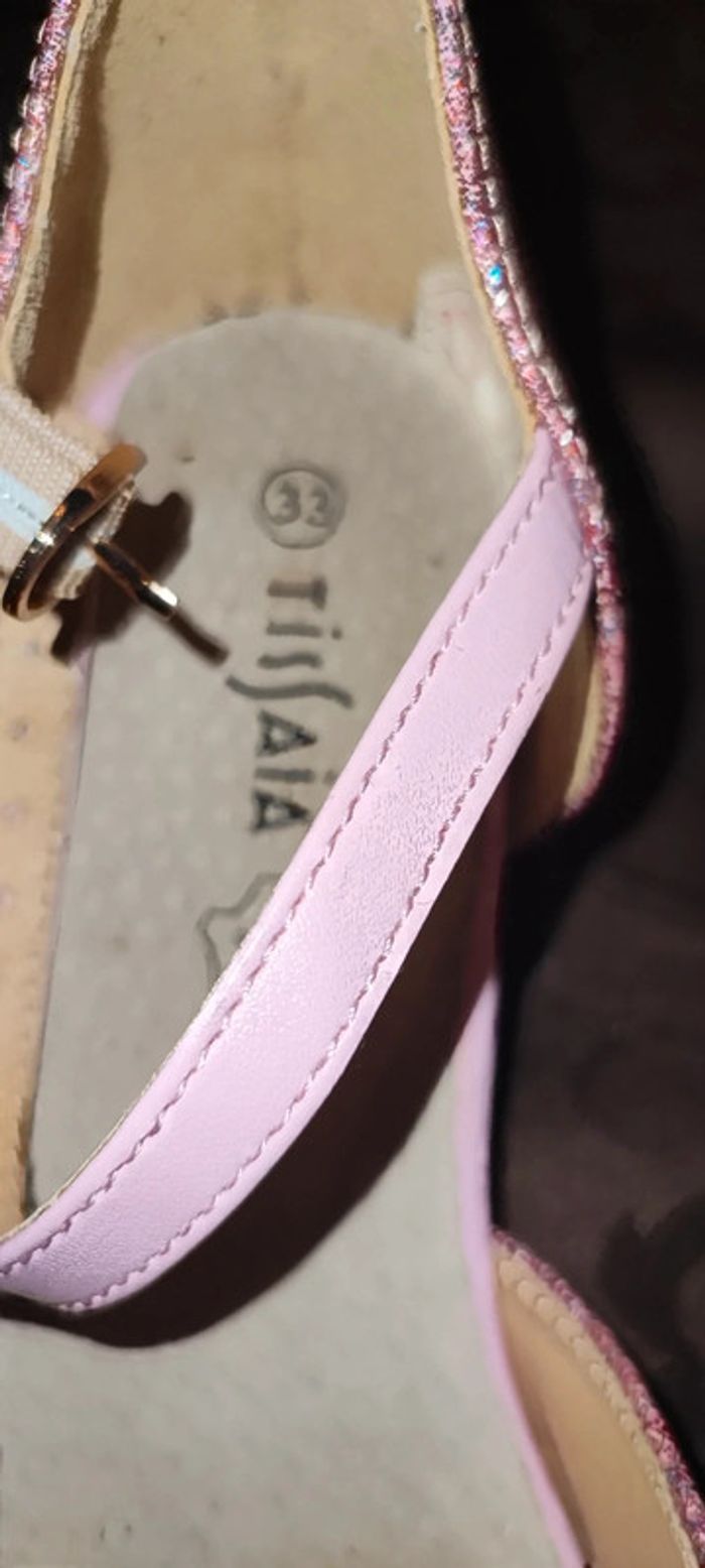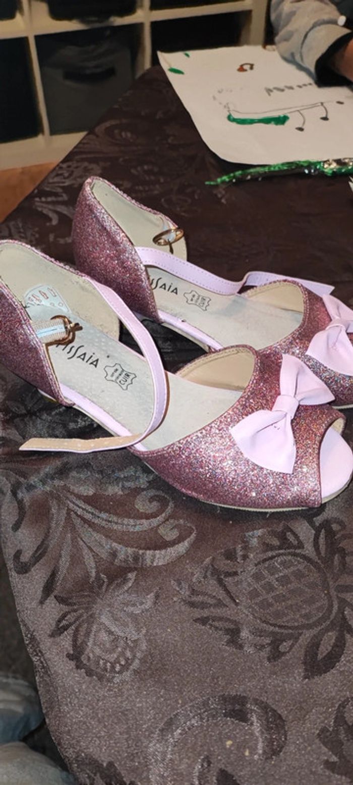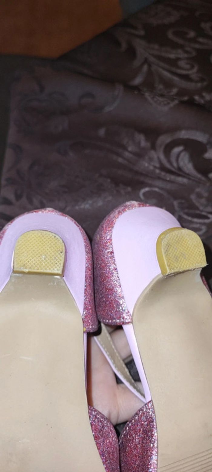 Chaussures fille rose à paillettes avec talon et neuneu sur devant ou ture 33 acheter chez Gémo 25€ porté 2h pour un mariage. Les paillettes dernière sont légèrement parties mes rien d'alarmant Semelle en cuir. Idéal pour soirée ou Noël. Rose claire et fushia.